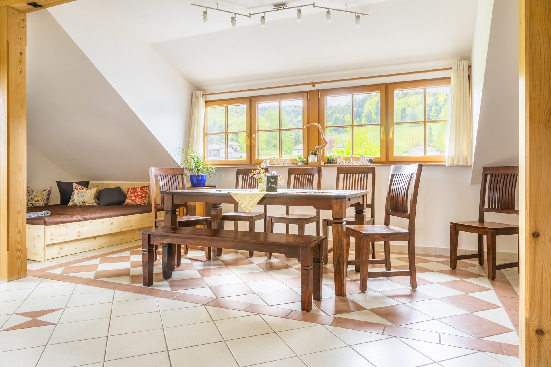 Die große Wohnung im Dachgeschoss des Bauernhauses bietet Platz für bis zu 6 Personen – perfekt für Familien. Die kleinere Wohnung im Nebengebäude eignet sich ideal für Paare oder kleine Familien mit bis zu 3 Personen.