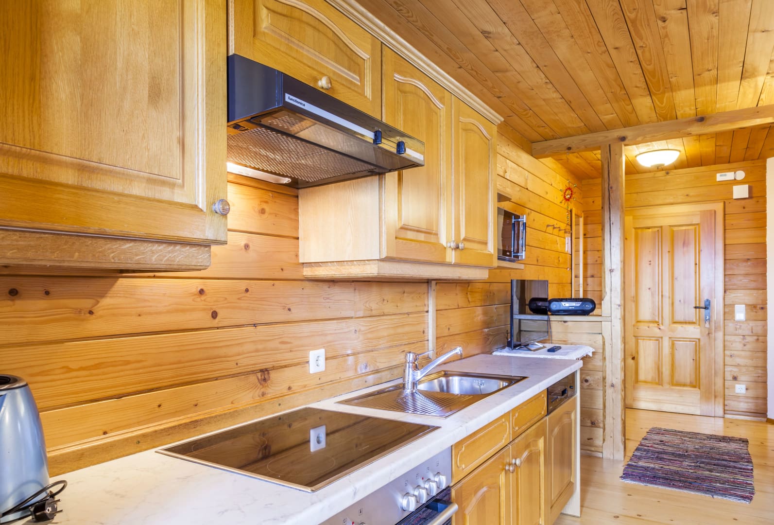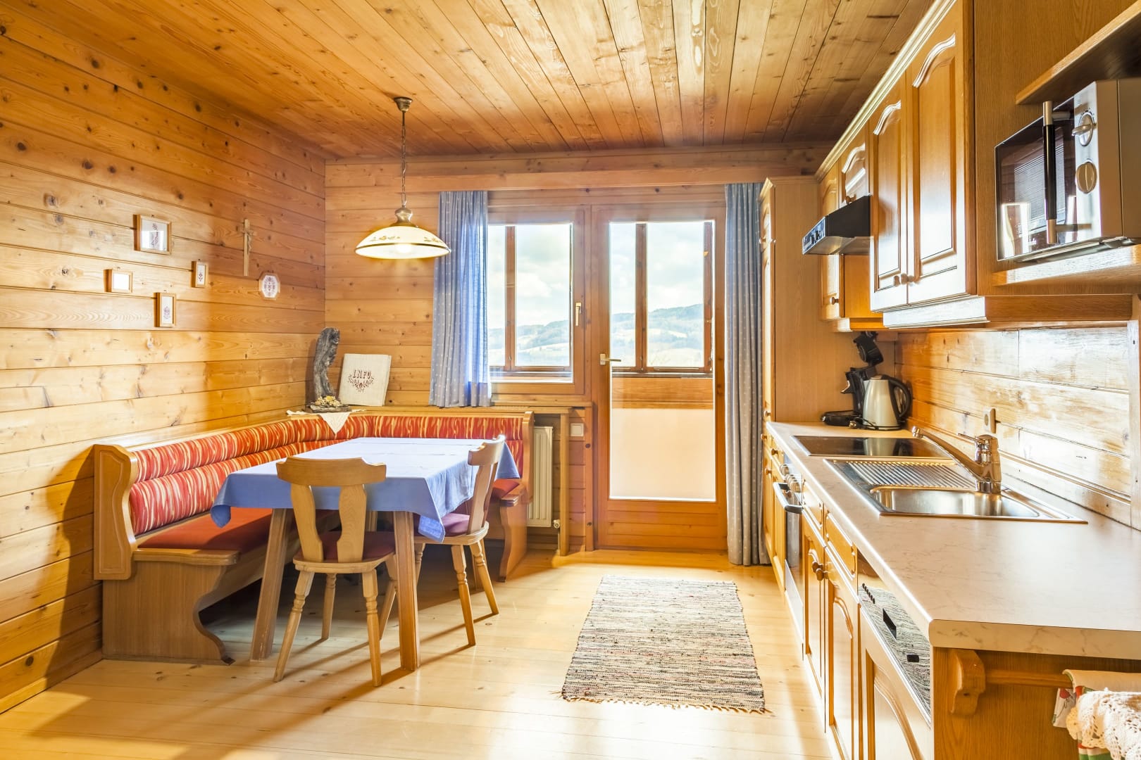 • Wohnküche mit Essbereich, Sofa, Kaffeemaschine, Mikrowelle, Geschirrspüler, Radio und Sat-TV