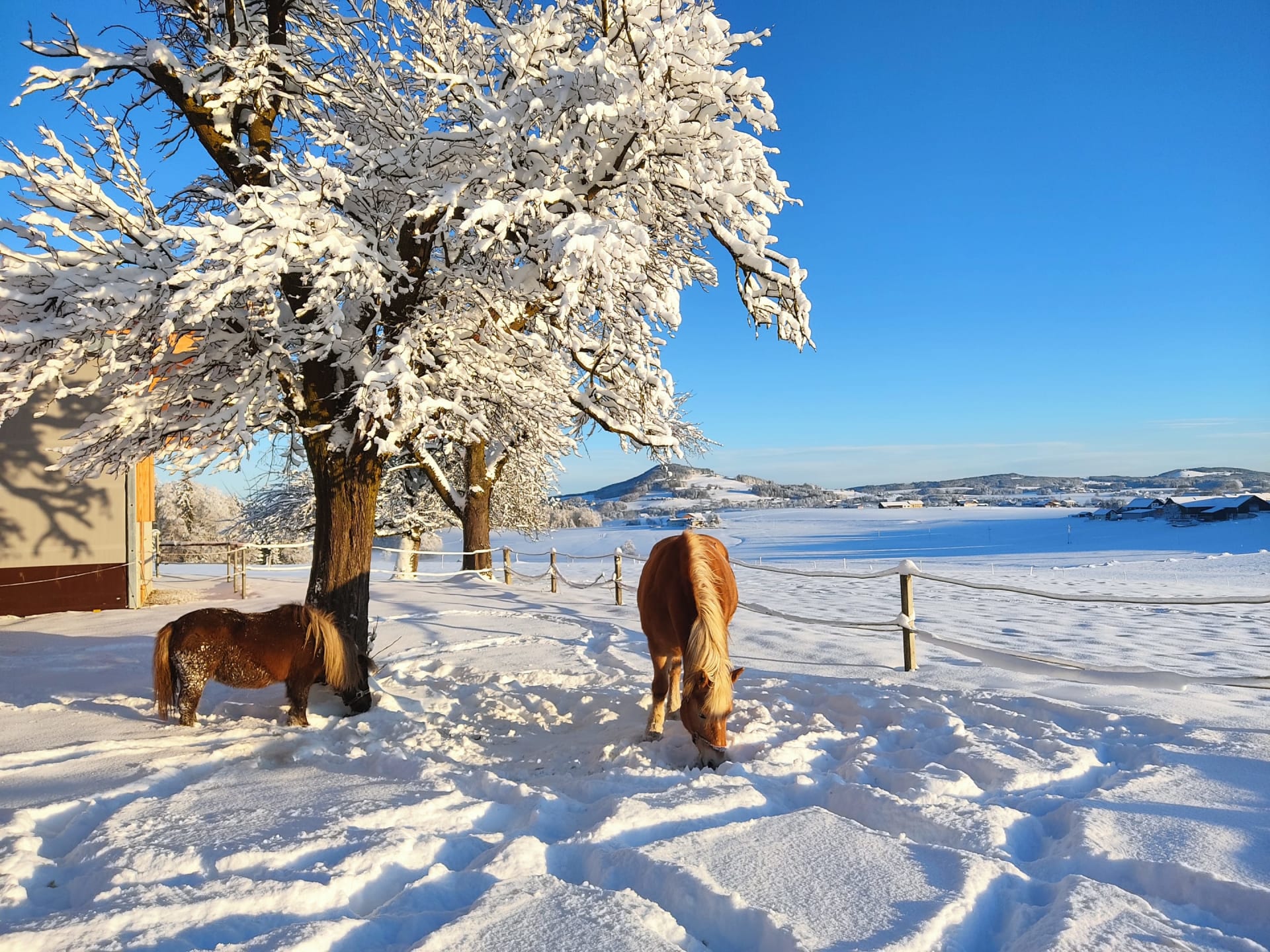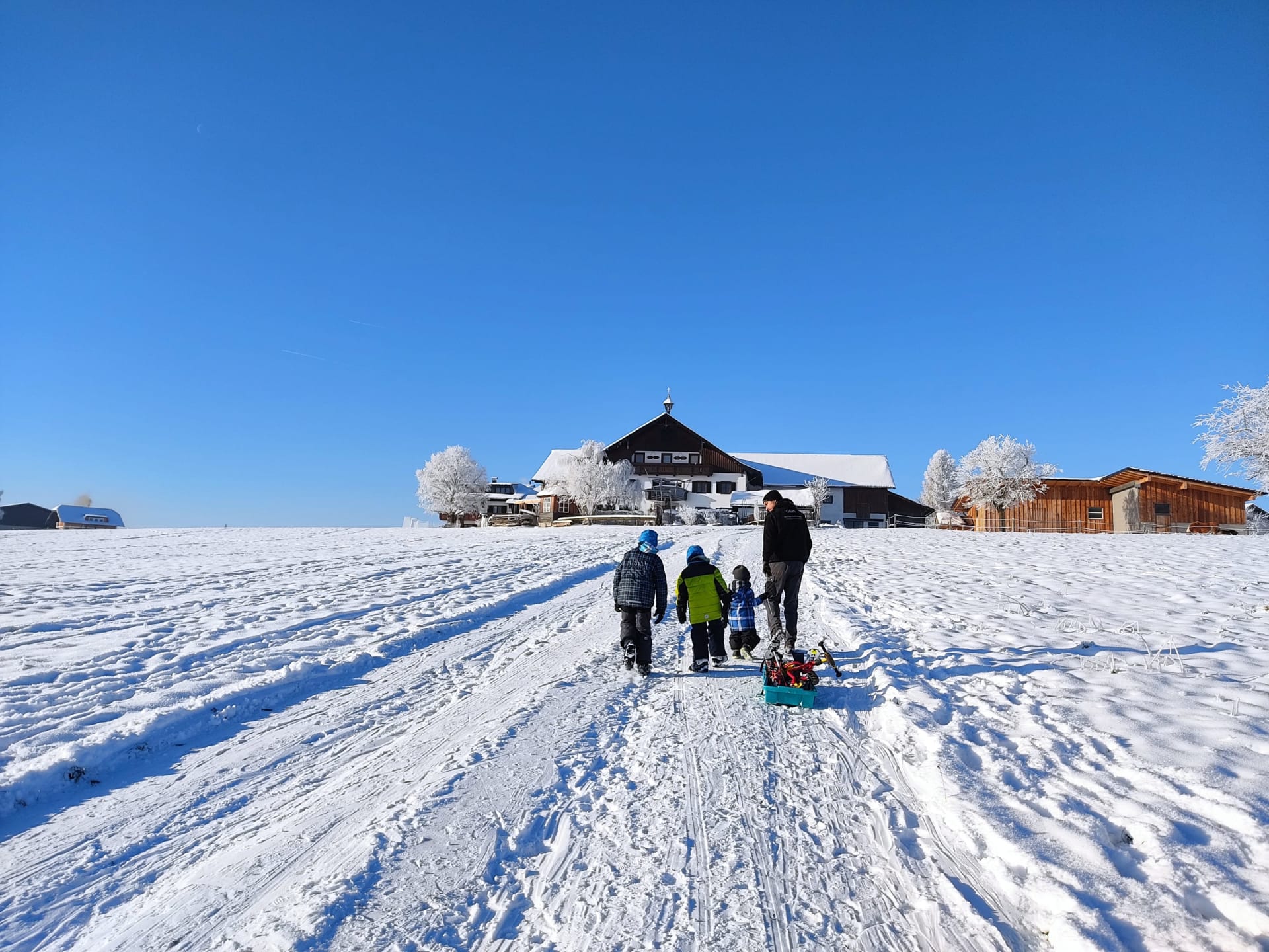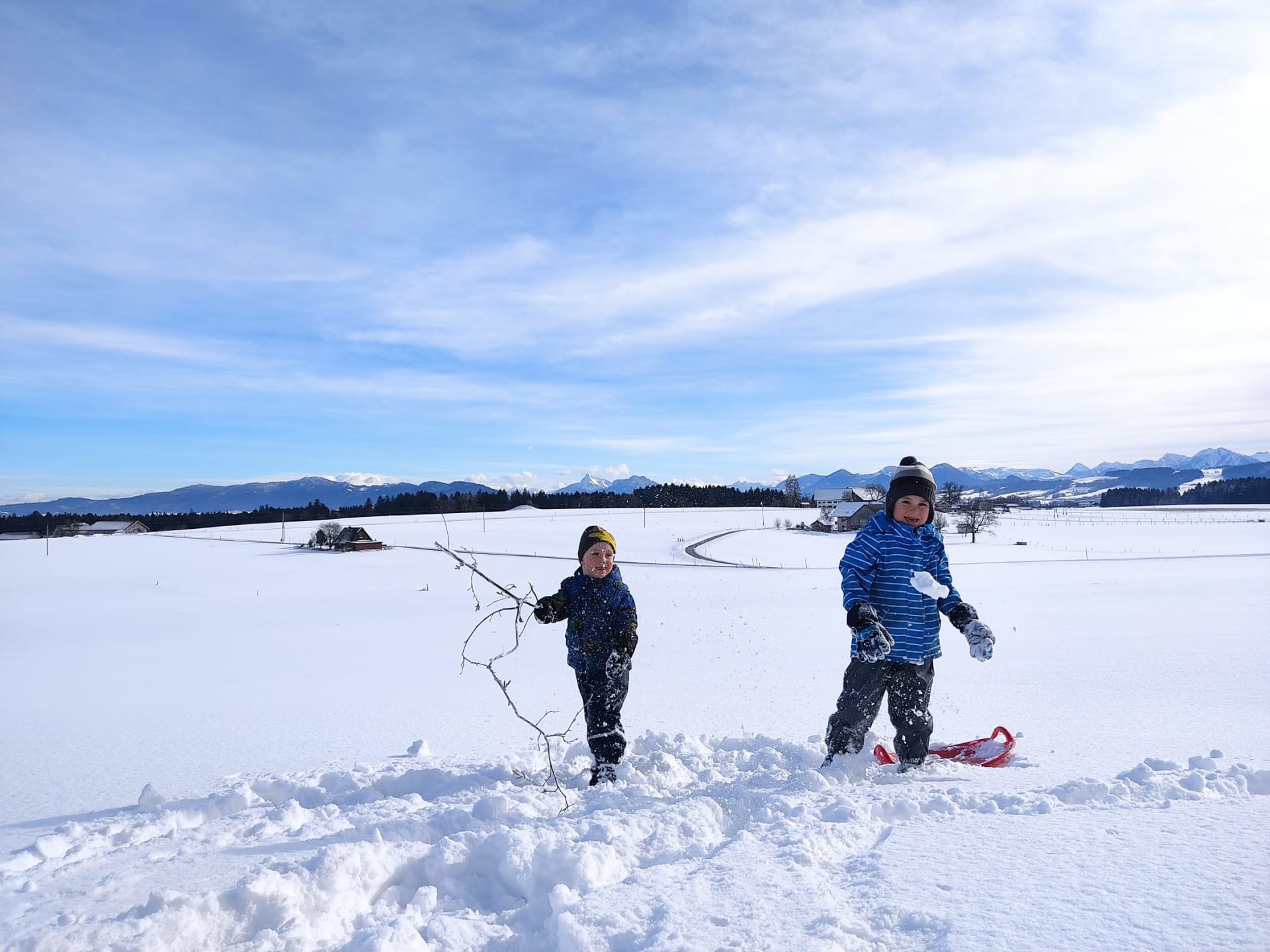 Schneeweiße Hänge rund um den Hof für Abfahrten mit den Bob und zum Schneemann bauen.