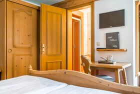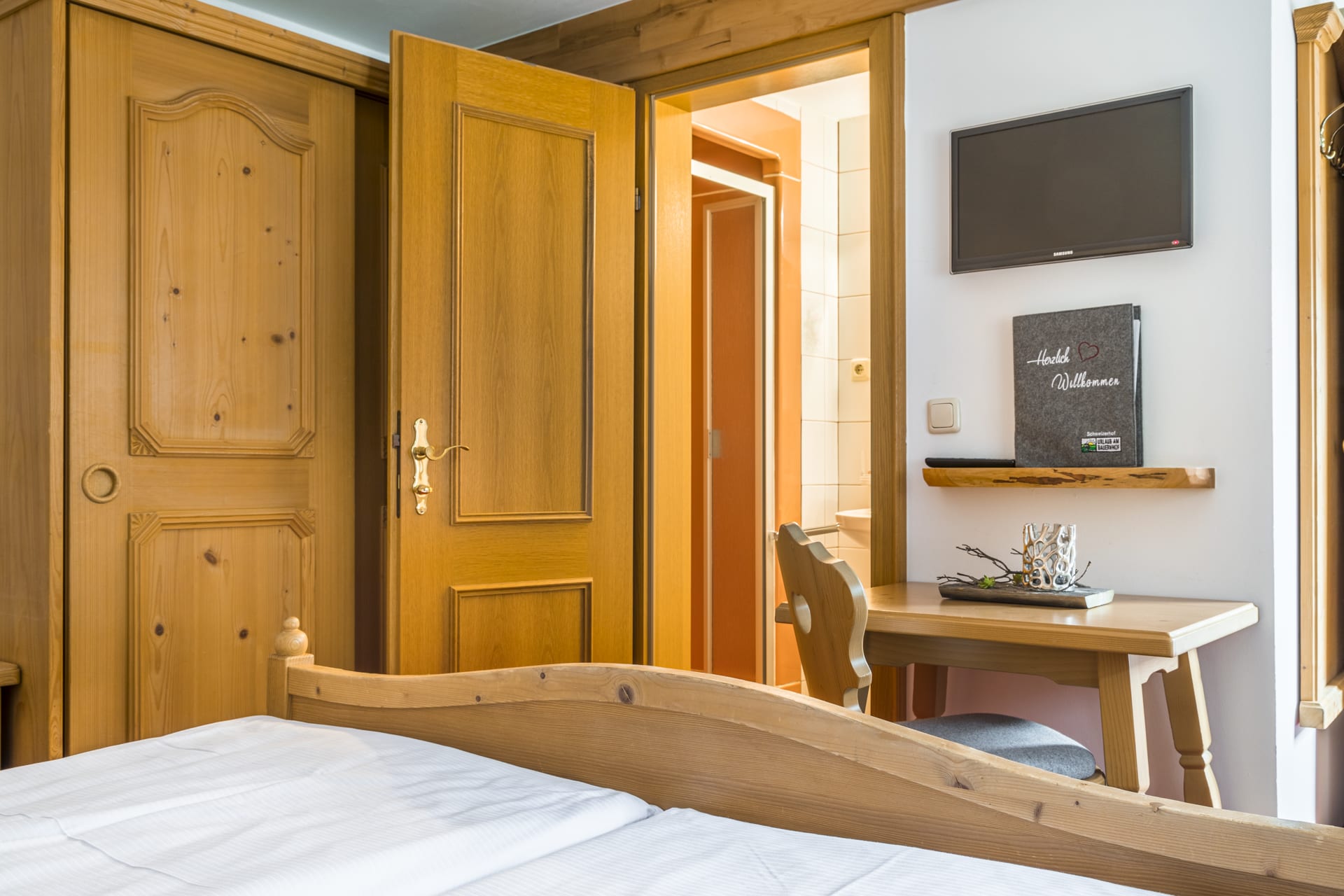 Unser Doppelzimmer ist liebevoll renoviert und mit Vollholz möbliert, mit Sitzgelegenheit, Bad mit Dusche/WC, sowie einen Balkon.