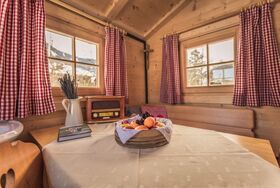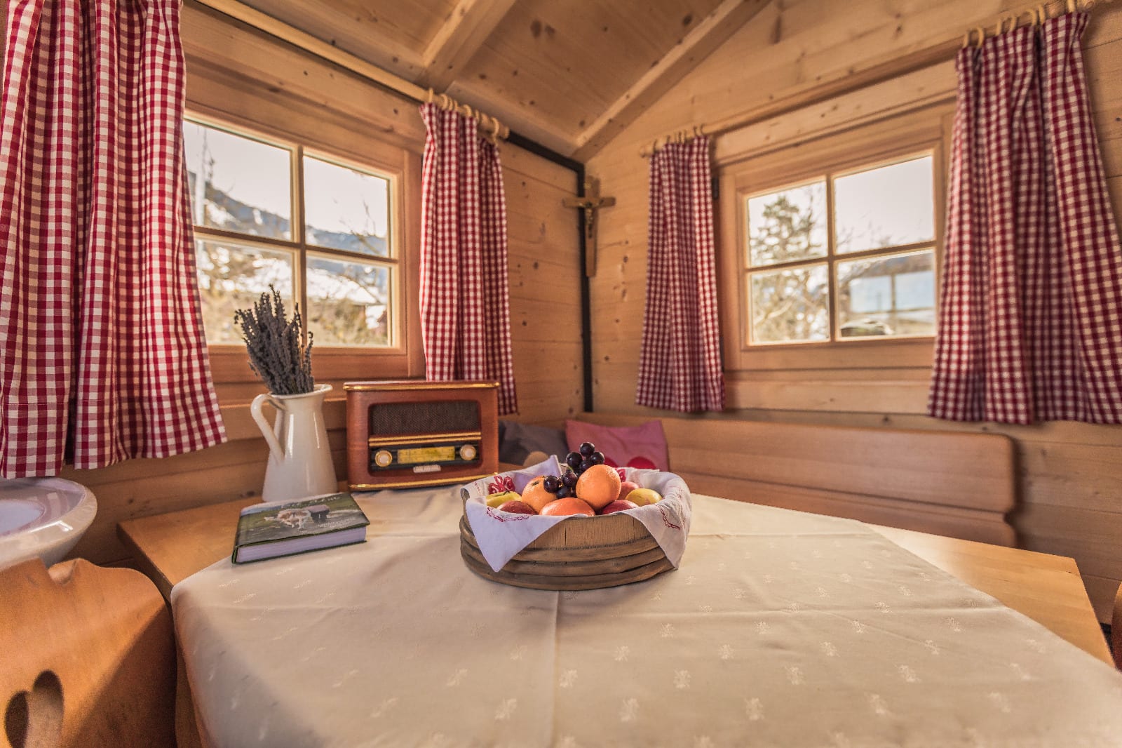 Ausgestattet ist das Hütterl mit einer Heizung, Waschbecken, Sitzecke mit Tisch sowie ein Bett. Auch die kleine Terrasse unter Apfelbäumen machen die Entschleunigung vom gewohnten Alltag perfekt.