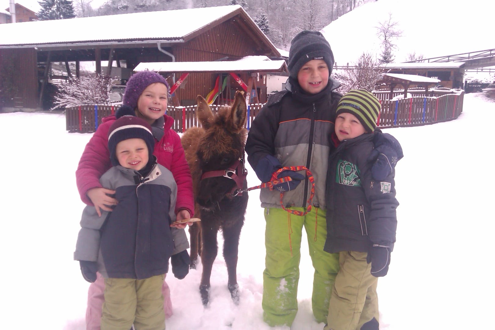 Tierfreunde kommen auf unserem ganzjährig bewirtschafteten Bauernhof voll auf ihre Kosten: Holstein-Milchkühe, Kälber, Schweine, Ziegen, Katzen, Hasen, Ponys, Ziegen, Esel, Hühner, Laufenten, Noriker Pferde und die liebe Hündin Nelly. Der Kinder-Streichelstall - die neue Heimat der Kleintiere - sorgt für besondere Tier-Erlebnisse für Groß und Klein. Auf Wunsch sind auch Tierspaziergänge mit dem Esel, Pony oder Ziegen im Schnee gerne möglich. Verleih von Schneeschuhen, Rodel und Schlitten gerne kostenfrei möglich.