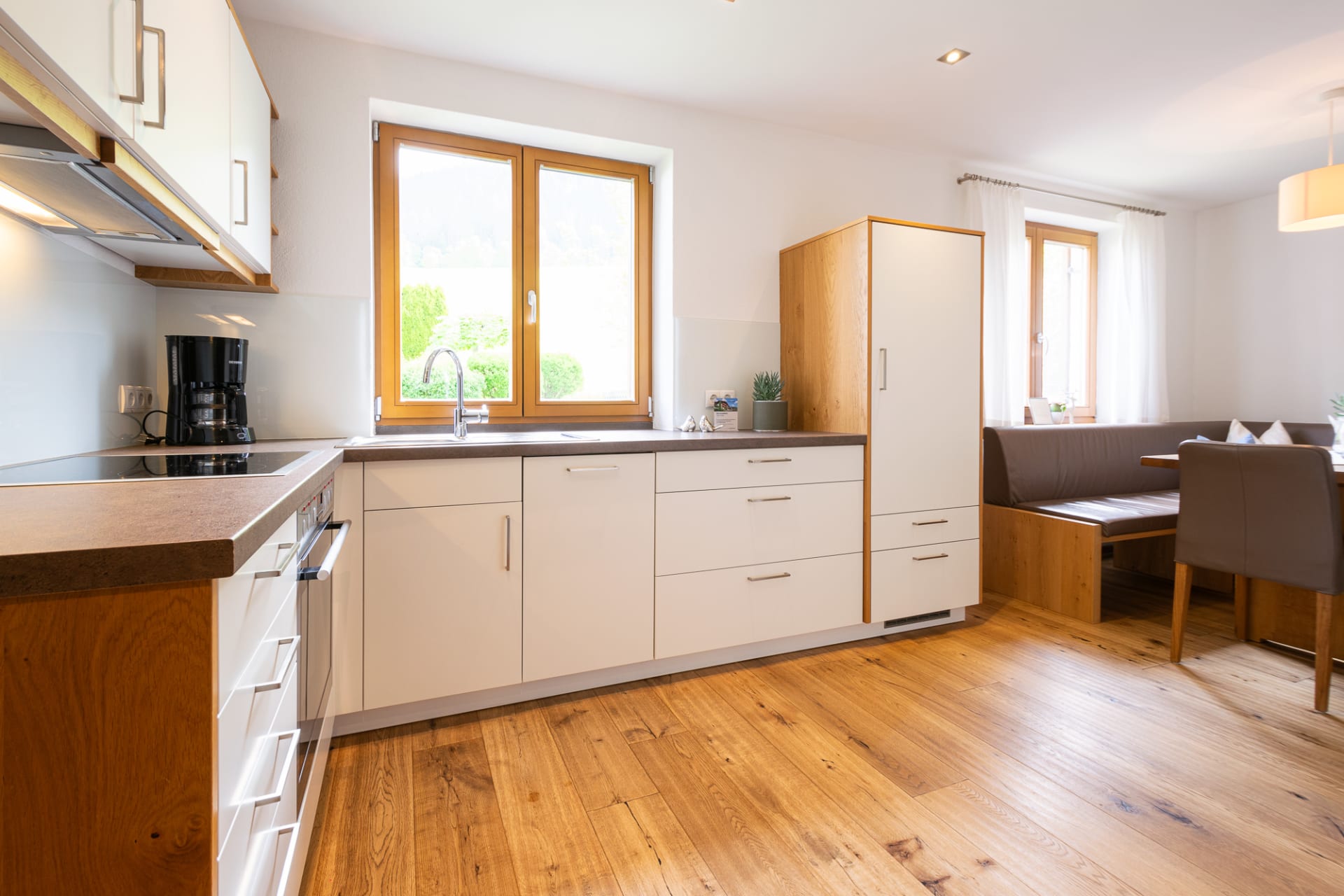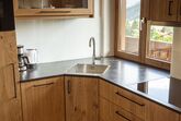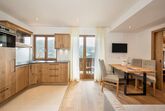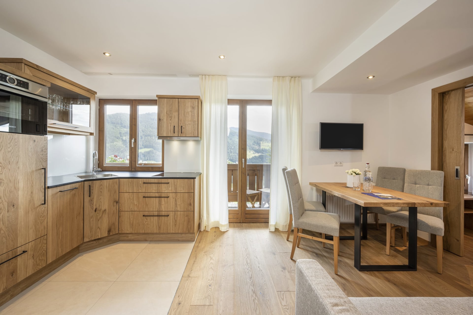 Außerdem ein gemütlicher Wohnraum mit komplett ausgestatteter Küche (Kaffeemaschine, Geschirrspüler, Backofen mit integrierter Mikrowelle) und gemütlicher Sitzecke sowie Balkon mit Blick auf Eben im Pongau.