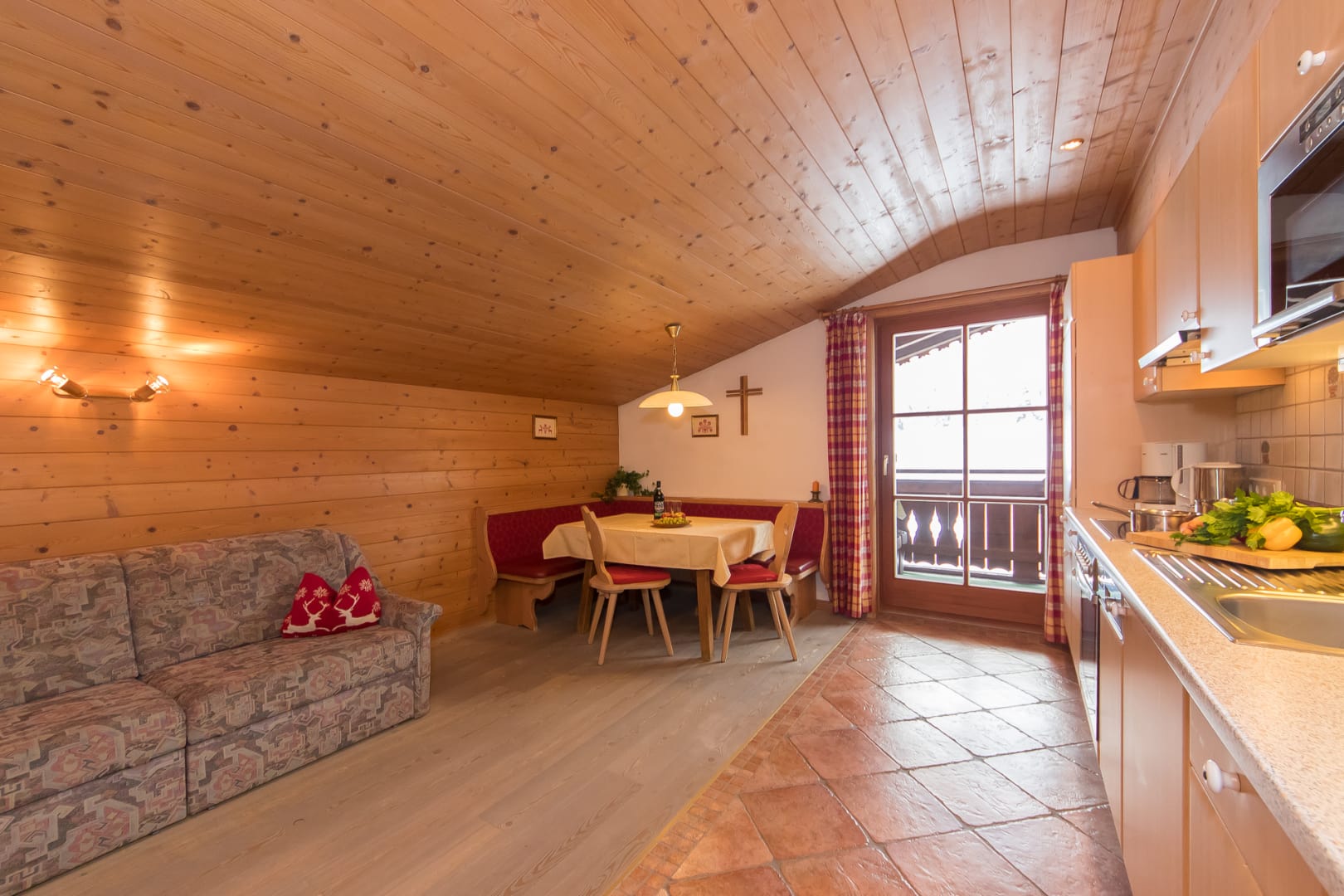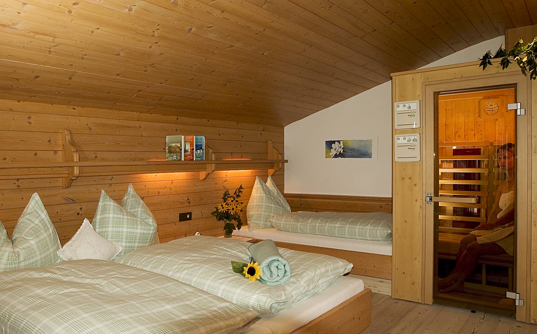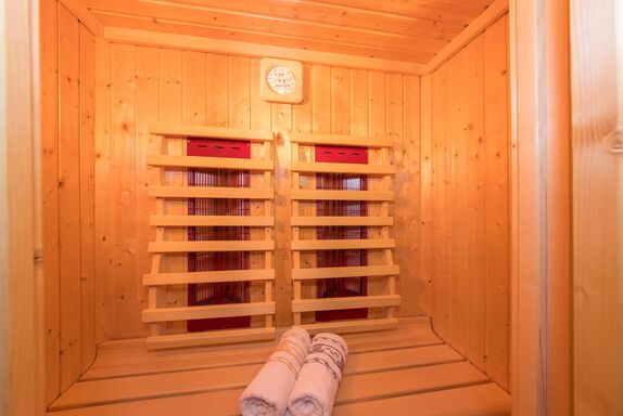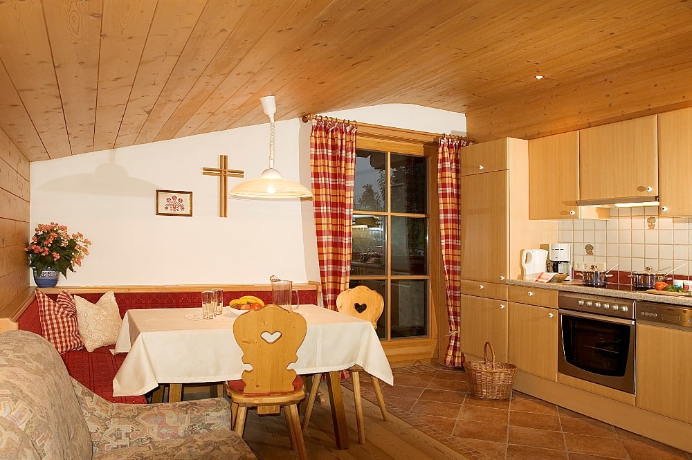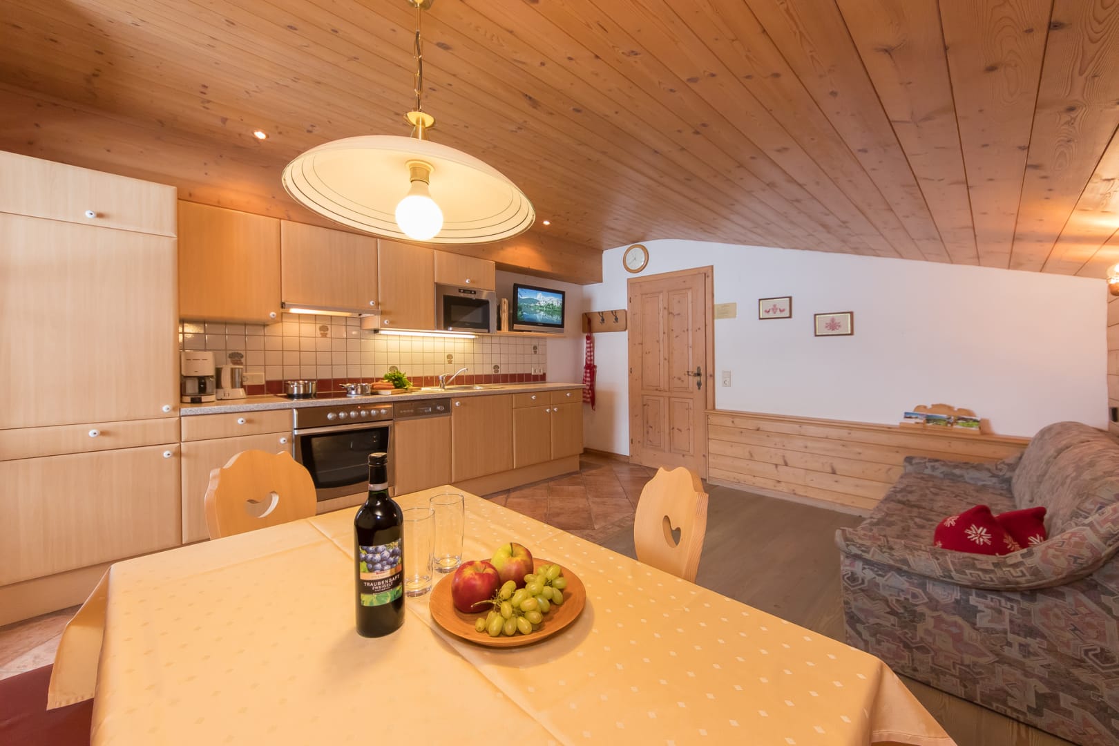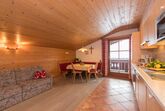 Komplett ausgestattete Küche, Geschirr, Kaffeemaschine, Wasserkocher, Backofen mit Cerankochfeld, Geschirrspüler, Toaster, Mixer, Brötchenservice, Gesellschaftsspiele, 2 Schlafräume mit je einem Doppelbett, 1 ausziehbare Doppelcouch, 2 Dusche/WC, Sat- TV, Radio, Balkon, Bett- u. Toilettewäsche vorhanden. Räume mit viel Holz. In dieser Wohnung befindet sich eine Infrarot- Wärmesauna. Wohnung mit Natur Vollholzböden. Gratis W-lan Zugang.