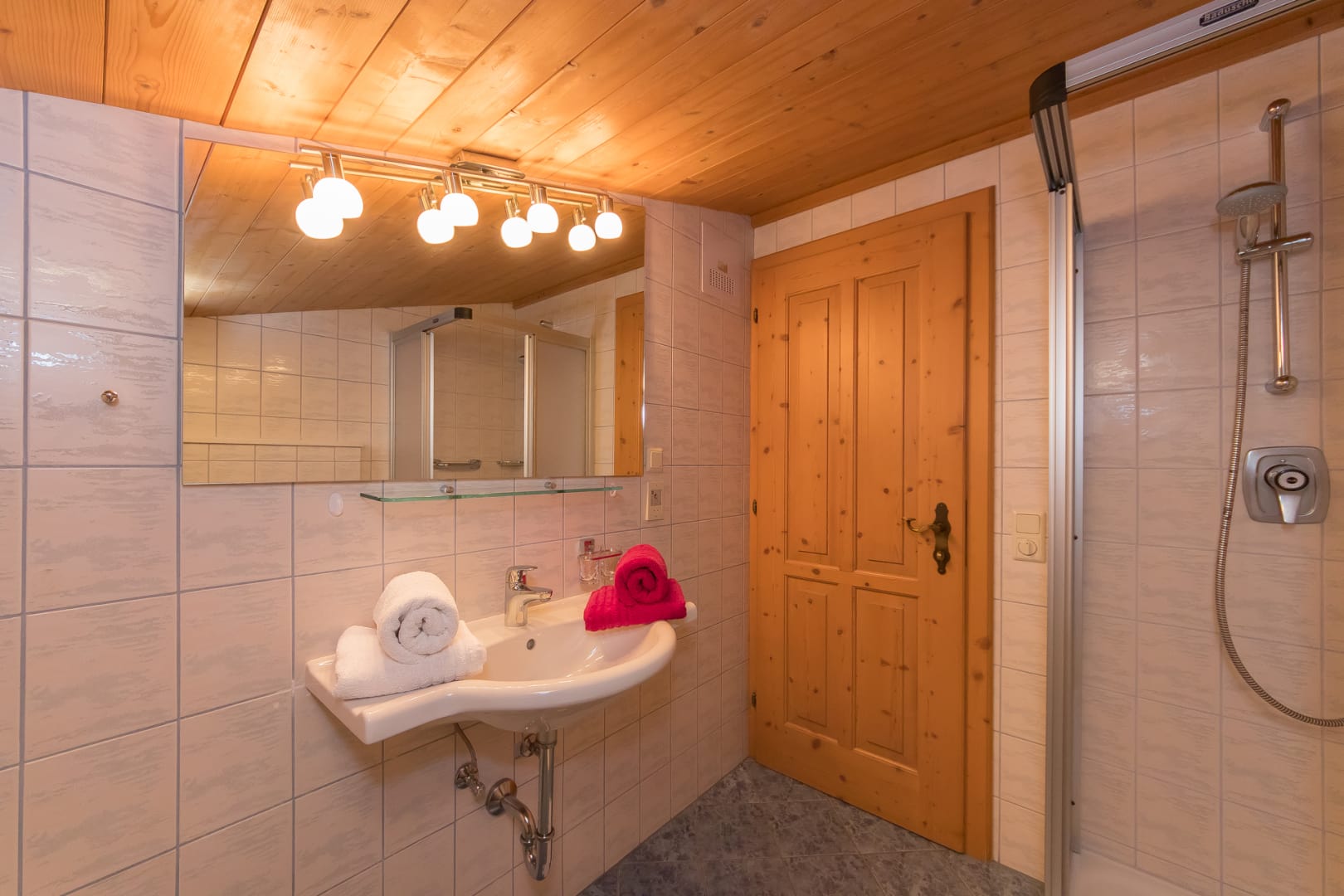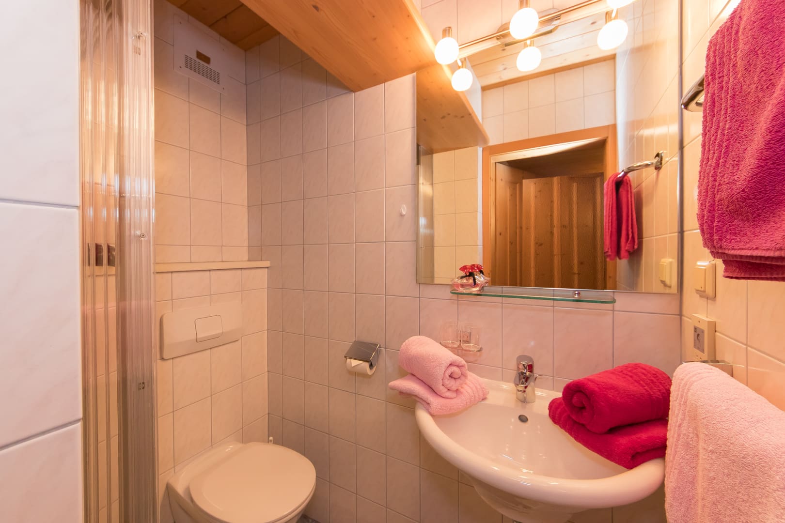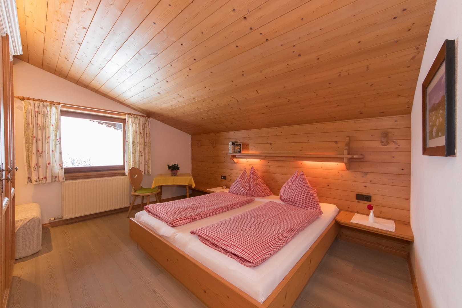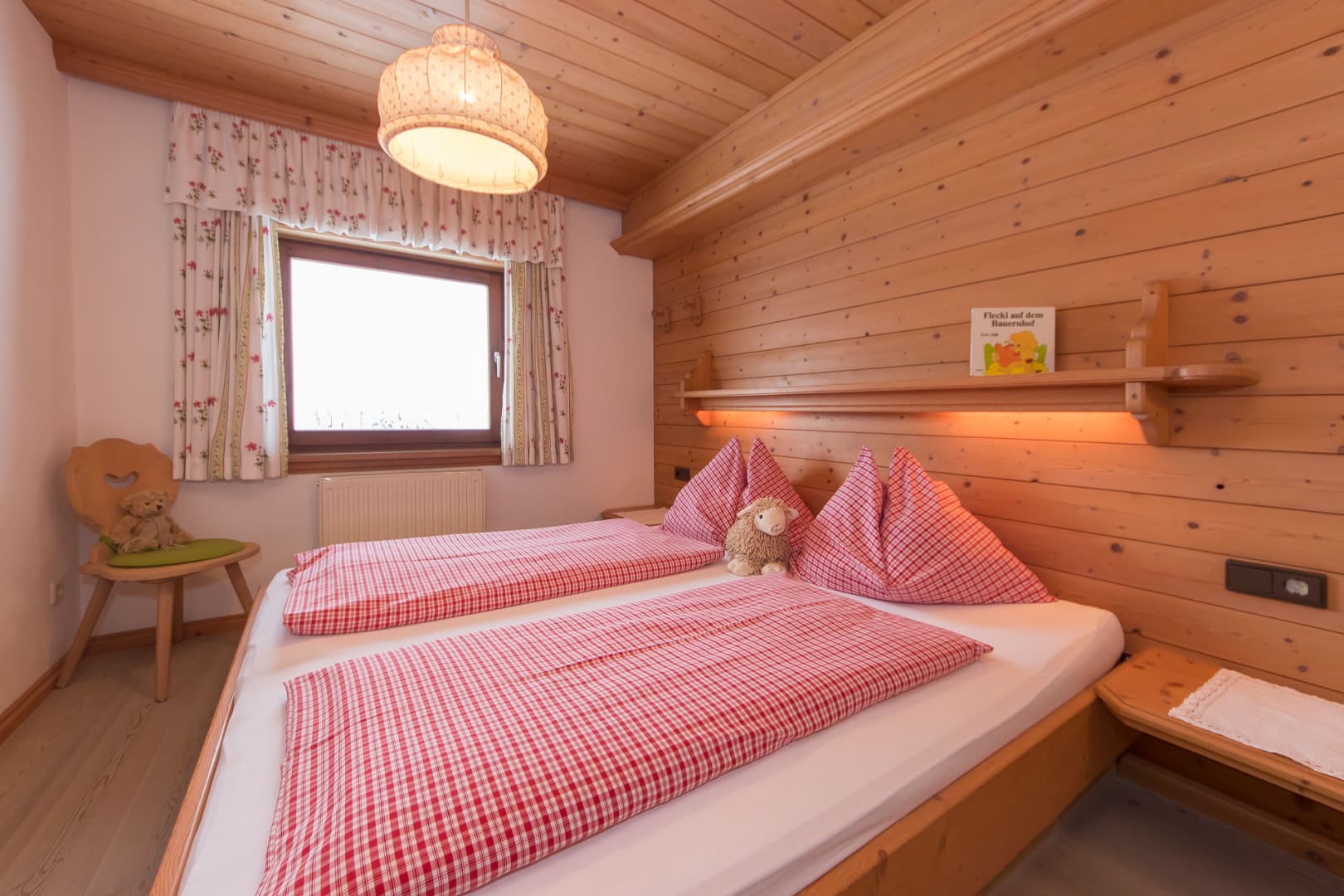 Komplett ausgestattete Küche, Geschirr, Kaffeemaschine, Wasserkocher, Backofen mit Cerankochfeld, Geschirrspüler, Toaster, Mixer, Brötchenservice, Gesellschaftsspiele, 2 Schlafräume mit je einem Doppelbett, 1 ausziehbare Doppelcouch, 2 Dusche/WC, Sat- TV, Radio, Balkon, Bett- u. Toilettewäsche vorhanden. Räume mit viel Holz. In dieser Wohnung befindet sich eine Infrarot- Wärmesauna. Wohnung mit Natur Vollholzböden. Gratis W-lan Zugang.