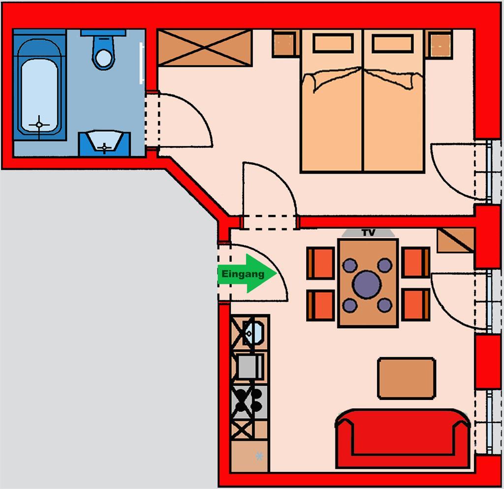 Appartement Peggy, ca. 30 m2, 1 Schlafzimmer, 1 Wohnküche mit ausziehbarer Couch, 1 Badezimmer mit Badewanne und WC, schöner Balkon.