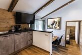 • komplett ausgestattete Wohnküche mit 4-Platten Cerankochfeld inkl. Backofen, Kühlschrank mit Gefrierfach, Geschirrspüler, Mikrowelle, Kaffeemaschine