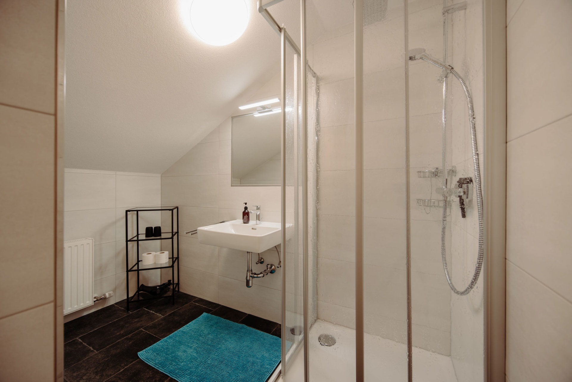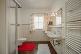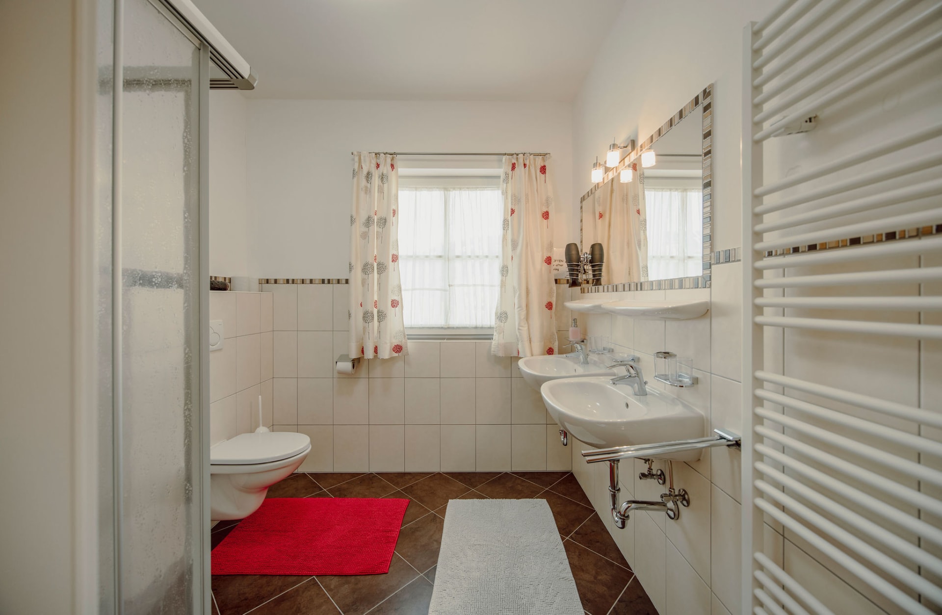 Das Bad ist ausgestattet mit einem Doppelwaschtisch, Dusche, Handtuchtrockner, Föhn und WC. Ein zweites extra WC steht euch auch zur Verfügung.