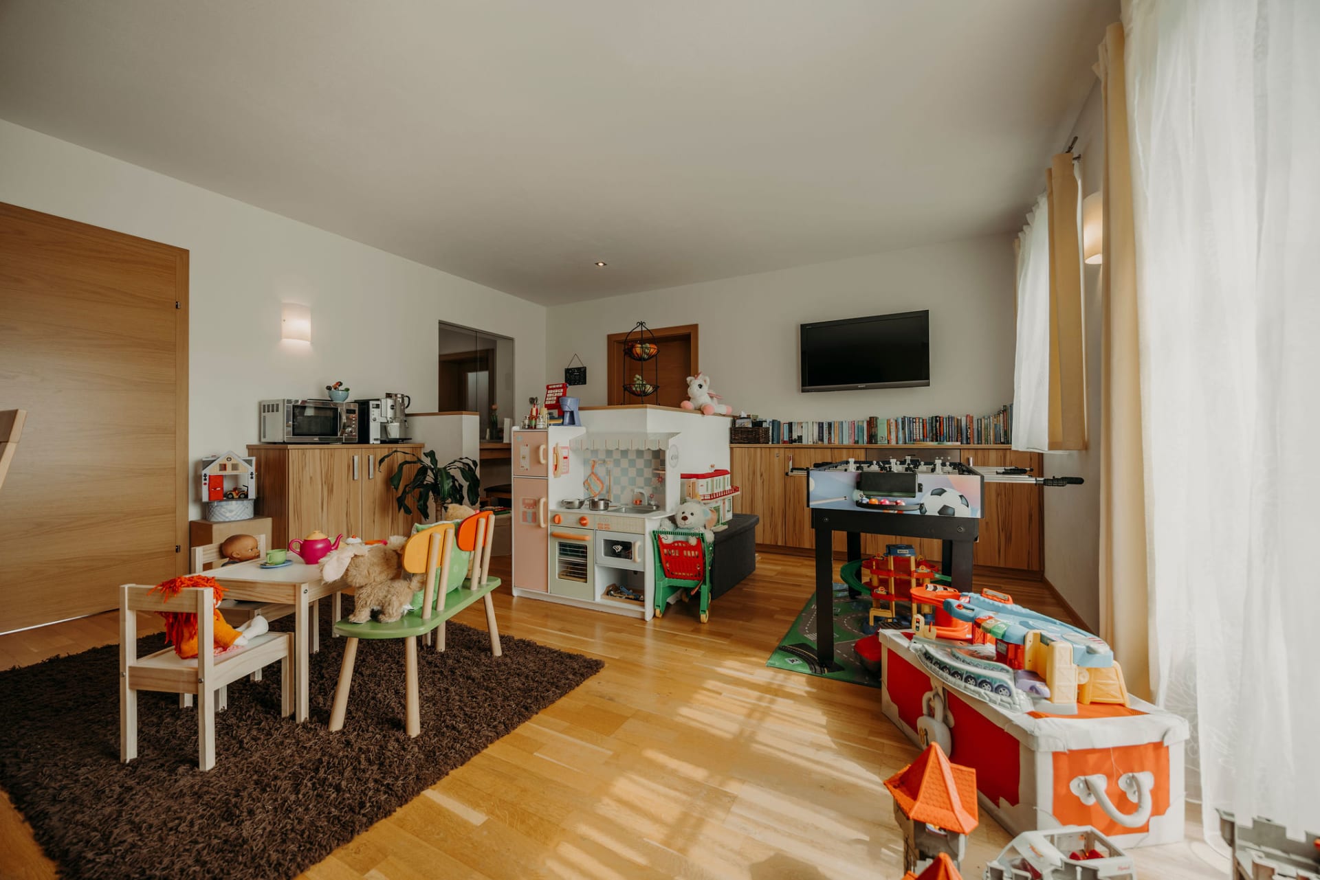 Der Garten bietet viel Platz für die Kinder. So können sich die Kinder beim Spielen auf der grünen Wiese, beim Trampolin springen oder beim Schneemann bauen im Winter, austoben. Währenddessen die Kinder das pure Bauernhoferlebnis genießen, erwartet die Erwachsenen viel Ruhe und Erholung auf dem Balkon oder der sonnigen Terrasse.