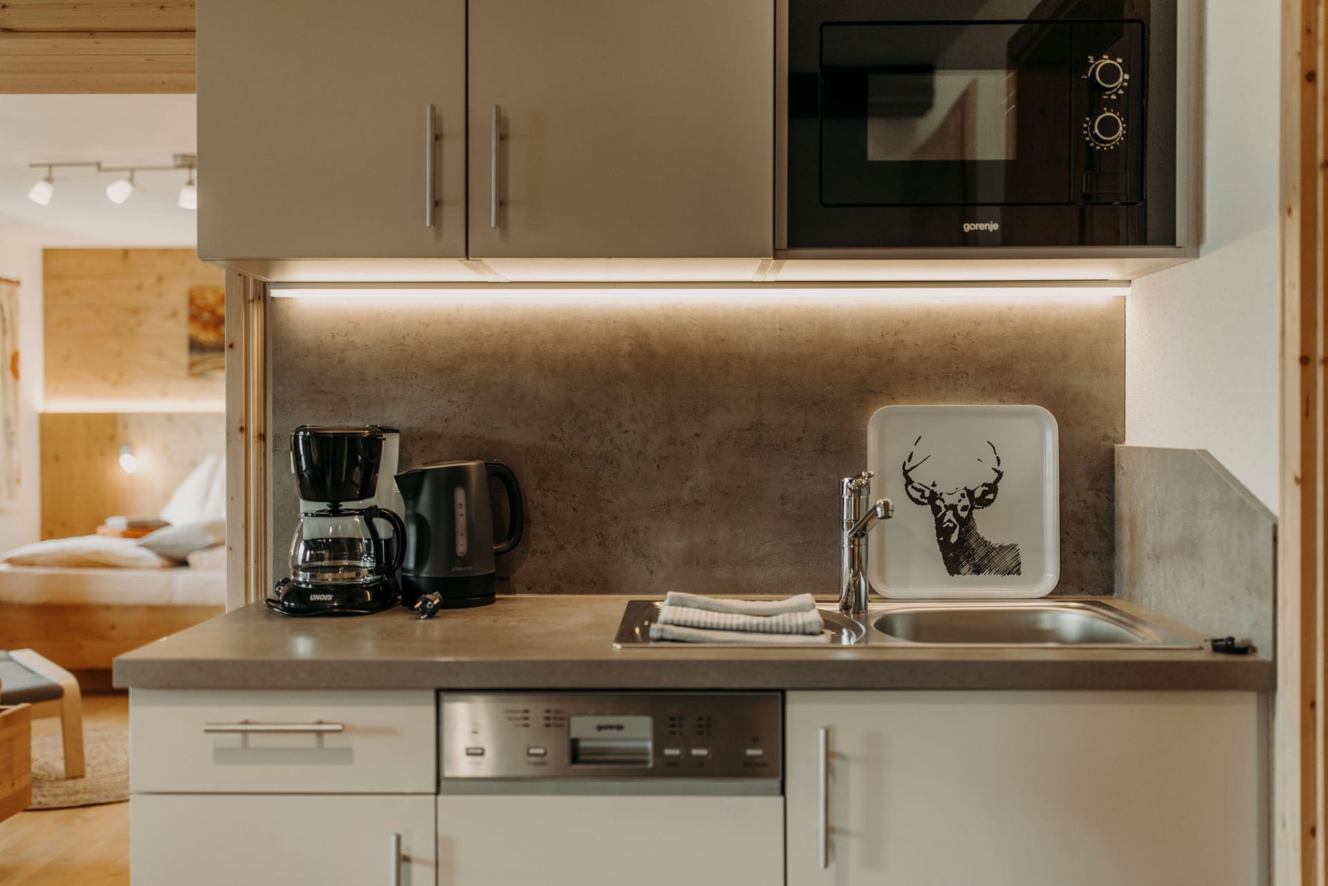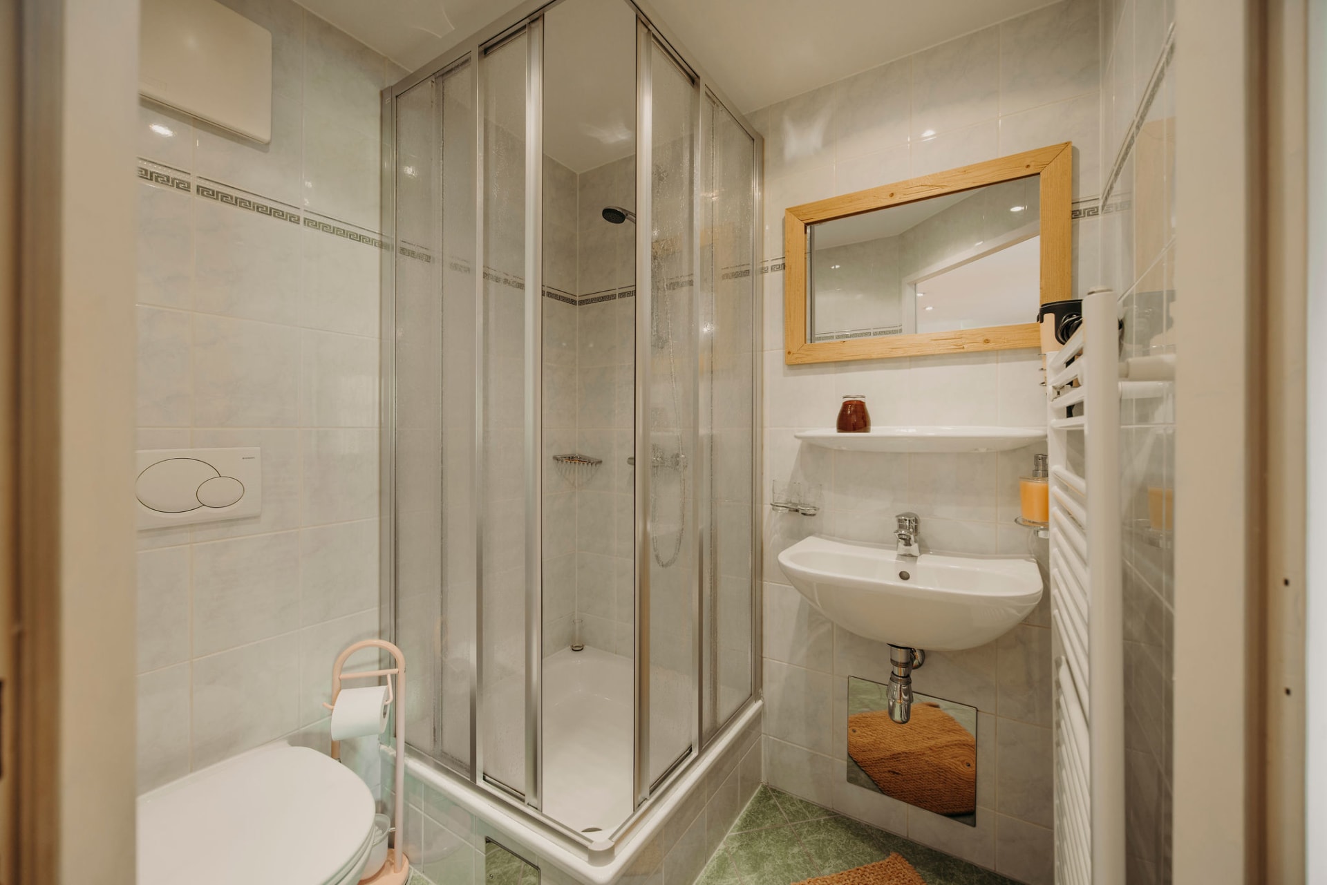 In jedem Zimmer befindet sich auch ein eigenes Bad mit Dusche, Waschbecken, WC und Föhn. Das Appartement hat zwei Küchen und zwei Essbereiche. Zwei Fernseher in den Wohnbereichen und zwei in den Schlafzimmern,