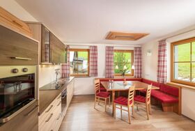 Die Bauernstube ist ausgestattet mit: Kühlschrank, Eierkocher, Wasserkocher, Toaster, Herdplatte, Smoothie–Maker, Geschirr, Geschirrspüler und Mikrowelle.