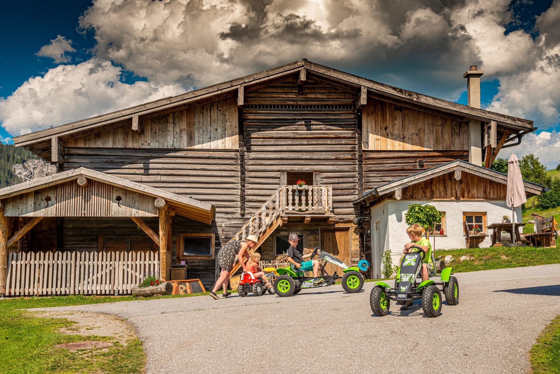 Bei uns am Hof erwarten euch im Sommer ein Teich mit Lagerfeuerplatz mit wöchentlichem Würstel grillen, eigener Garten zum Entspannen, Kleintiere zum Streicheln, Reiten, Fahrräder, Go-Karts, Trampolin und Spielplatz zum Austoben.