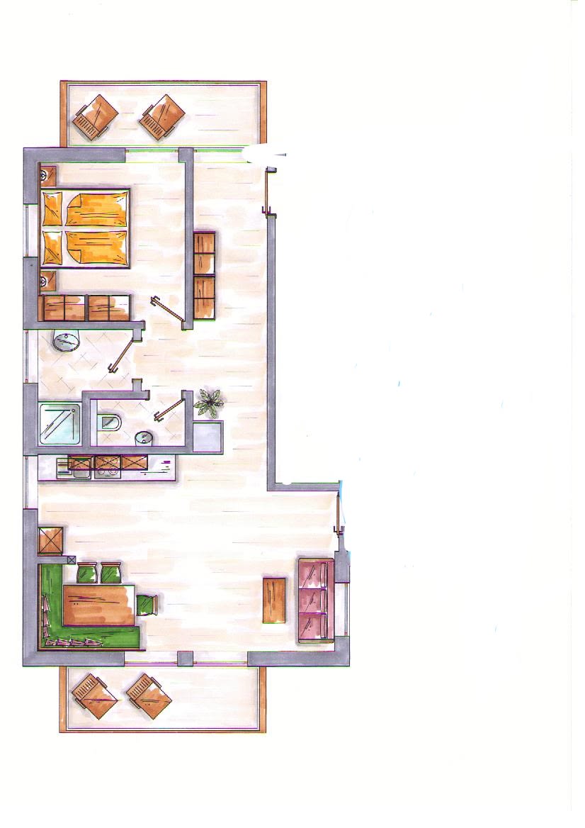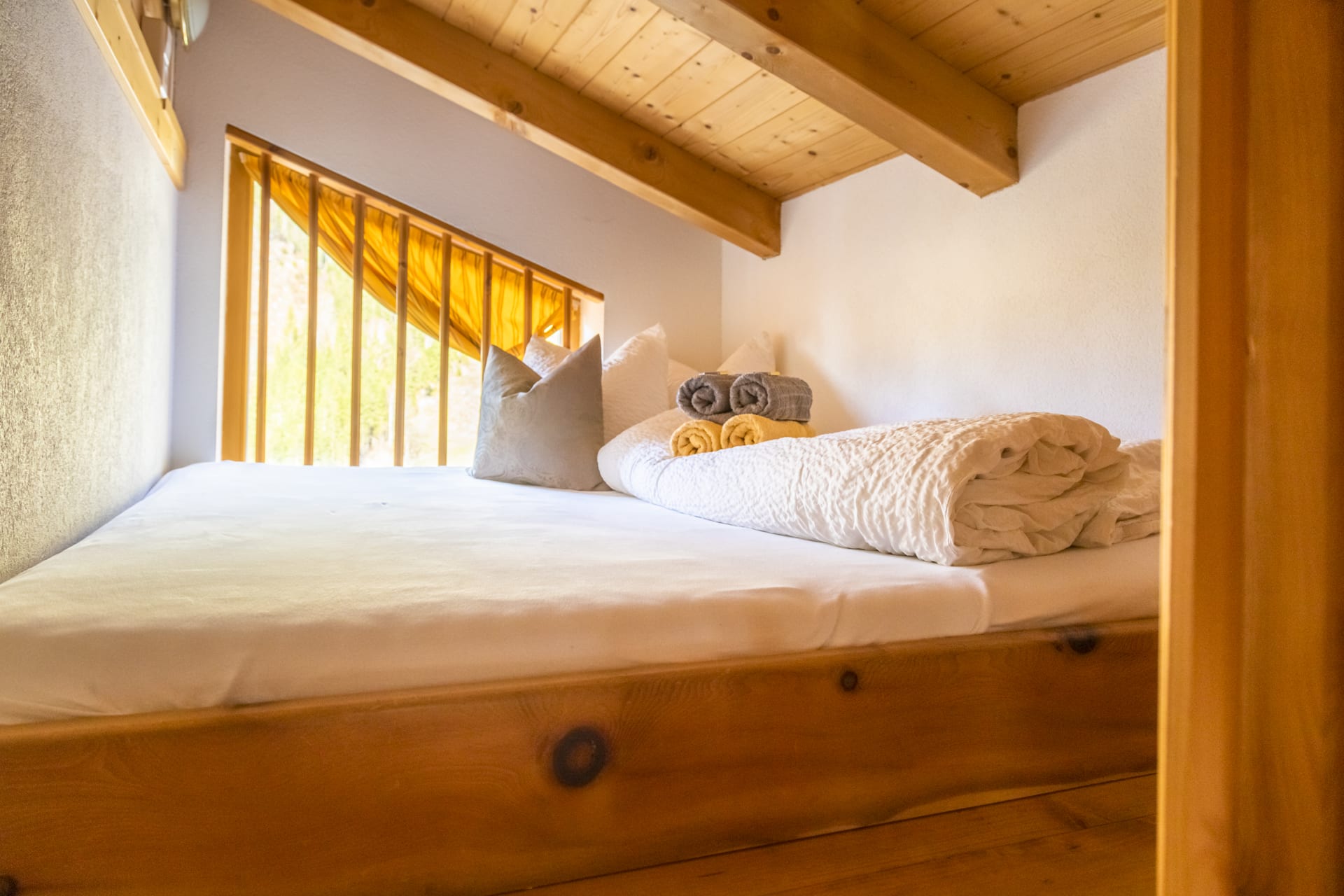 Erster Stock mit zwei Balkone. Ein Schlafzimmer mit Doppelbett und eine Empore mit Schlafgelegenheit für zwei Personen (erreichbar über eine kleine Treppe).