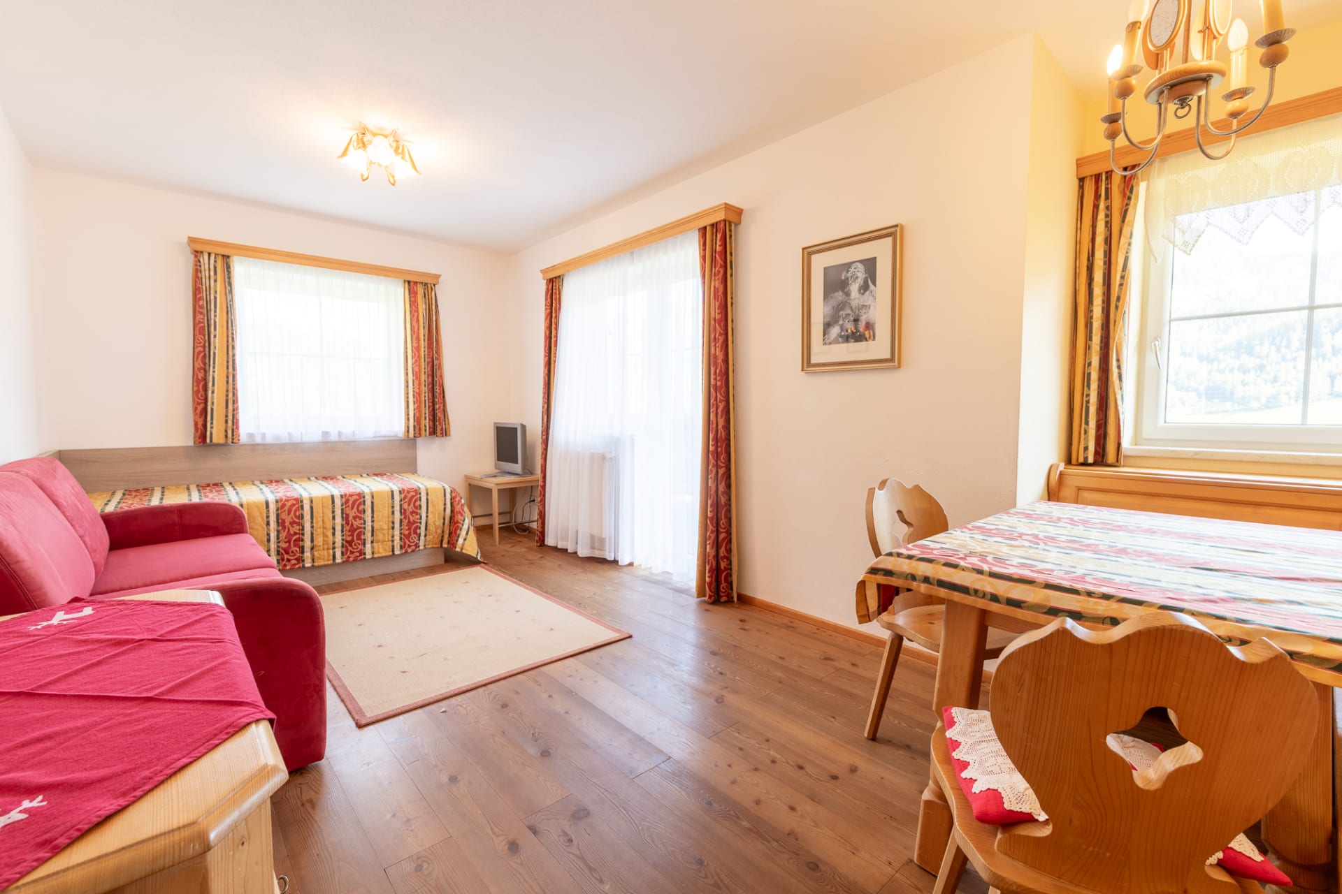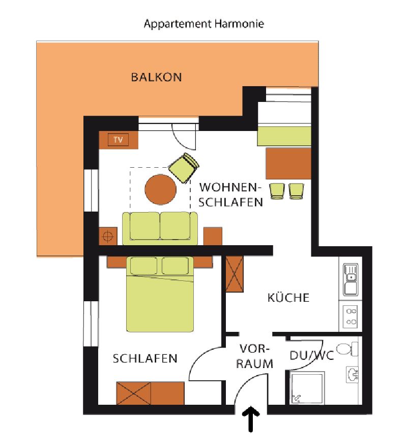 max. 2 Erwachsene und 2 Kinder. Das Appartement Harmonie verfügt über einen Wohn- und eigenen separaten Schlafbereich. Das Badezimmer (Dusche und WC) ist großzügig ausgelegt. Der Wohnbereich verfügt über einen Essbereich, eine Schlafcouch für Kinder, eine Küchenzeile sowie einen Balkonzugang.