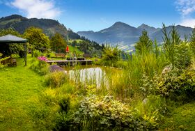 Zu den Annehmlichkeiten gehören eine Sauna im Garten mit Liegestühlen, Schwimmteich, Spielplatz und Spielraum für die Kinder.