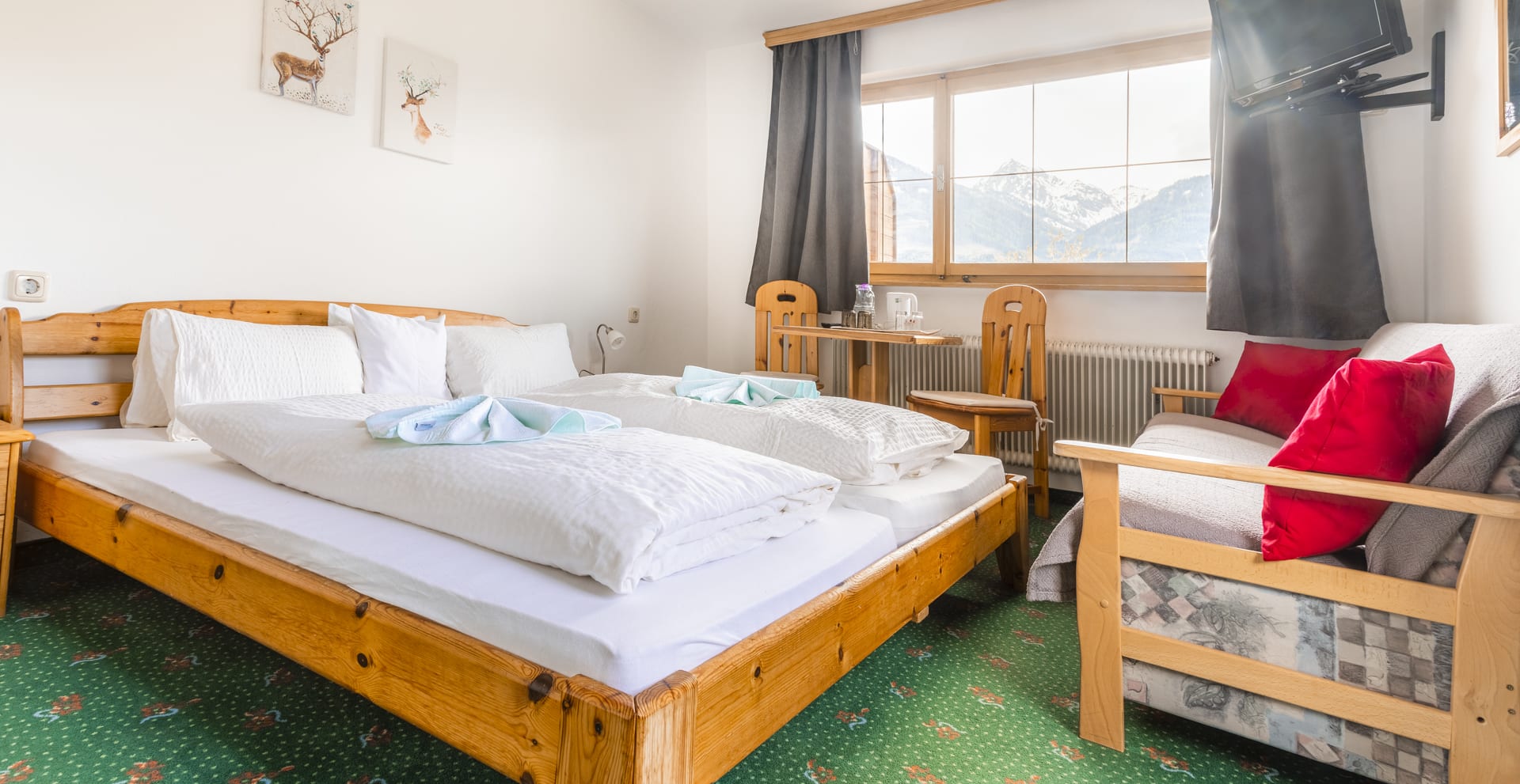 Davon sind 2 Zimmer mit Zusatzbett (Einzelbett 1mx2m) und Ausziehcouch verfügbar und bieten Platz für 4 Personen.