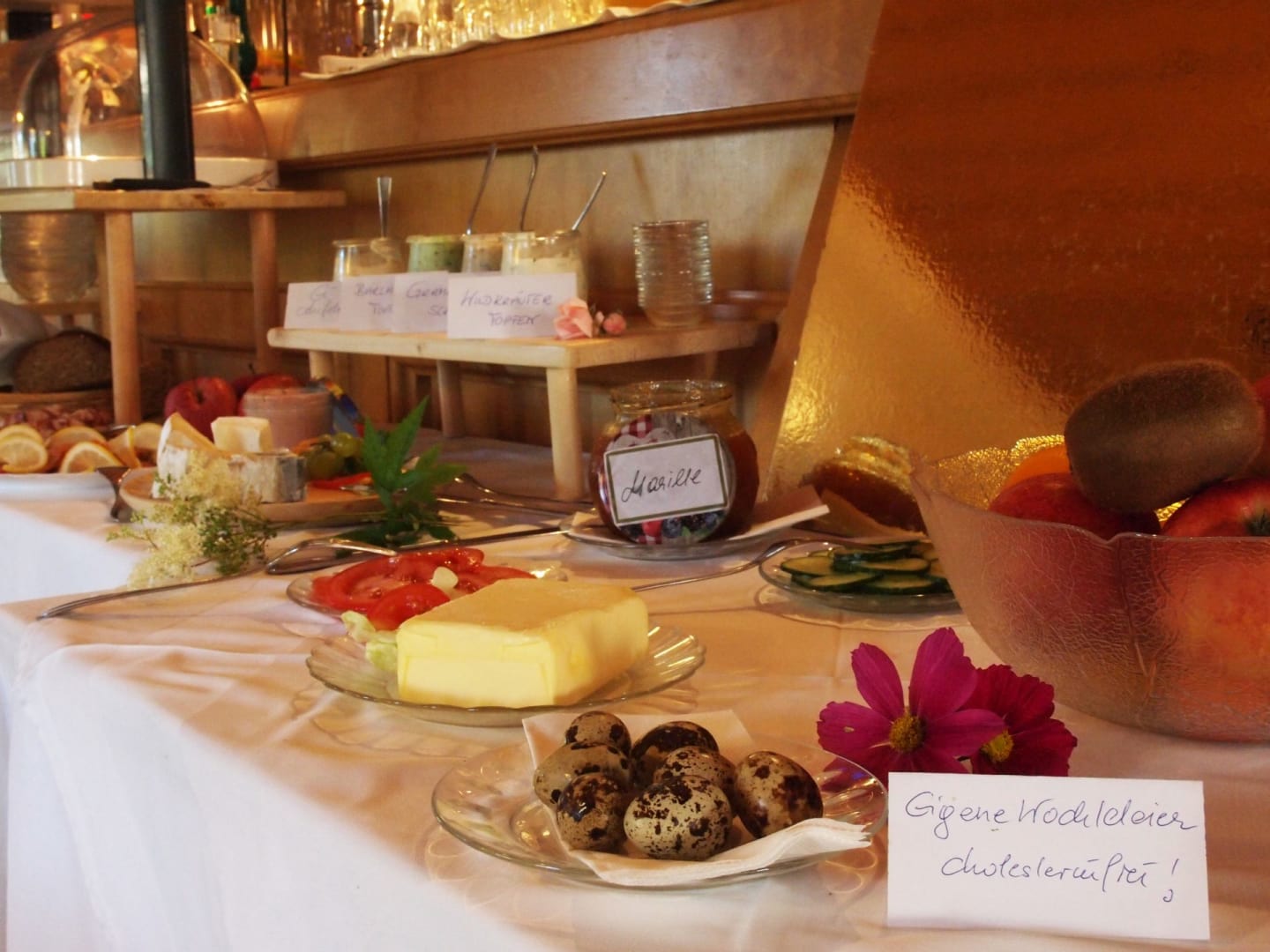 Am großen Frühstücksbuffet finden Sie auch selbsterzeugte Produkte wie Brot, Marmeladen, verschiedene Aufstriche, Käse und Speck. Das Restaurant ist bekannt für seine gute Küche mit regionalen Produkten und frischen Kräutern. Buchen Sie das günstige 4 Gang Menü der Halbpension.