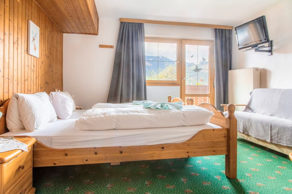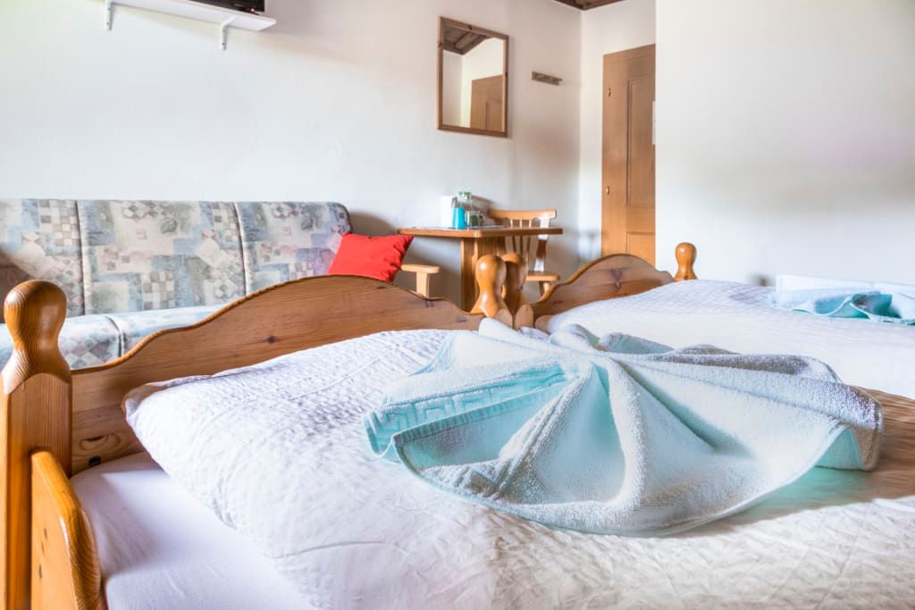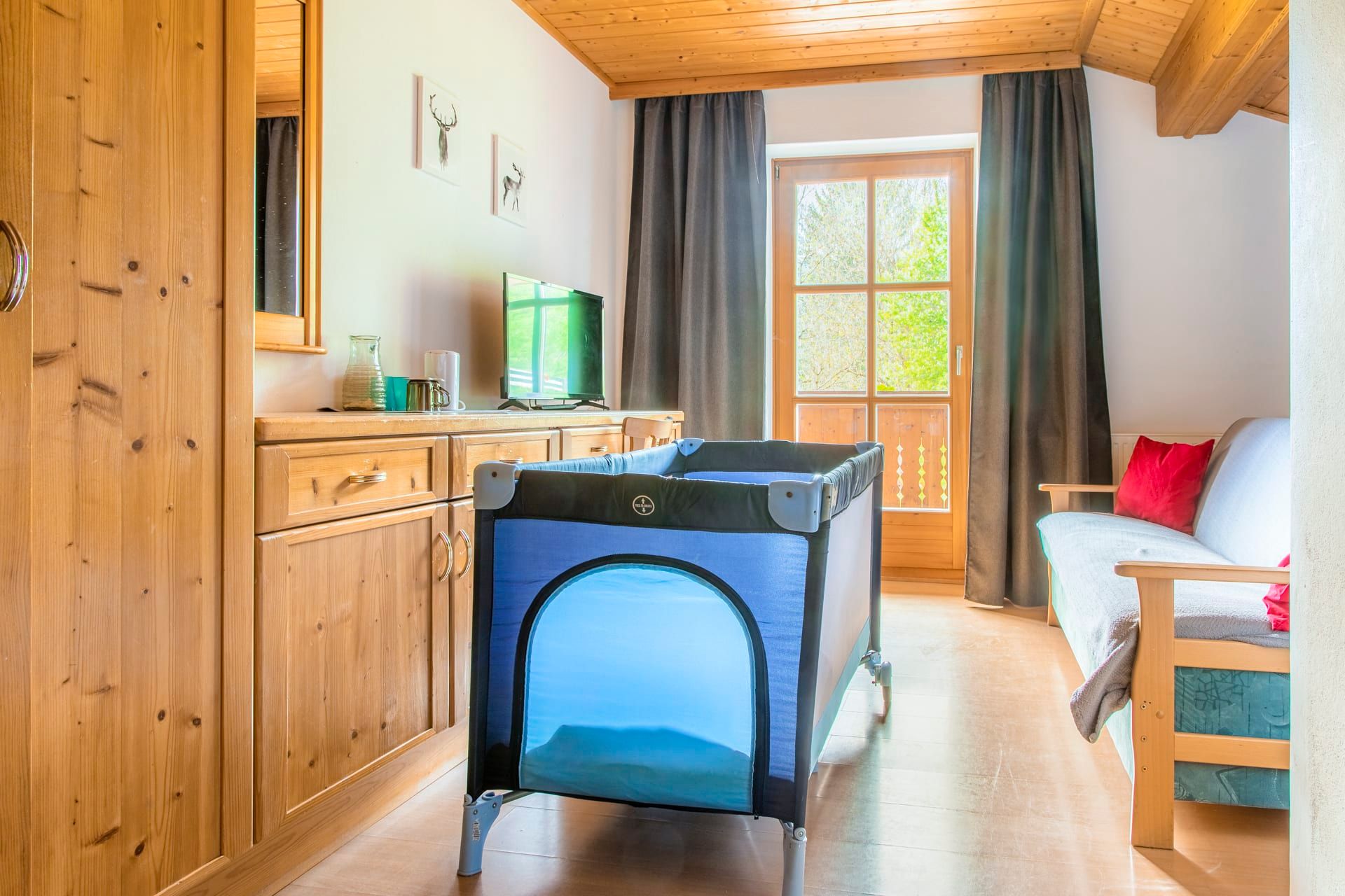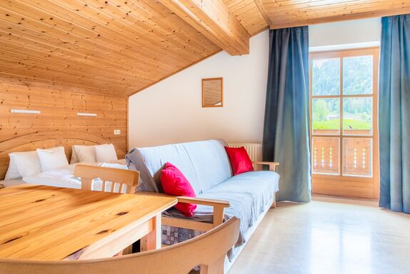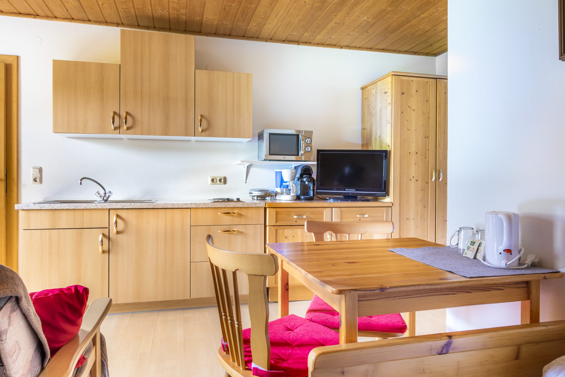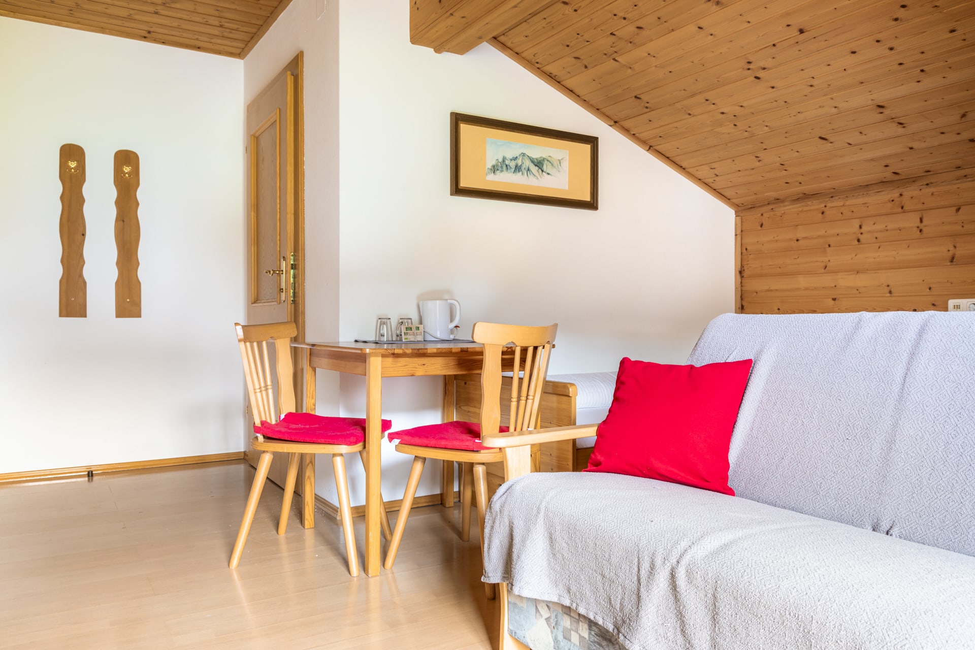 Entdecken Sie unser einladendes 1-Raum-Apartment im charmanten Altbau! Auf großzügigen 35 m² bietet es Platz für bis zu 4 Personen und ist traditionell mit Vollholzmöbeln eingerichtet, die eine warme und gemütliche Atmosphäre schaffen. Das Apartment verfügt über ein komfortables Kingsize-Doppelbett, ein Einzelbett sowie eine ausziehbare Schlafcouch. In der gut ausgestatteten Küchenzeile finden Sie alles, was Sie für die Selbstversorgung benötigen: eine Mikrowelle, einen Kühlschrank, einen Toaster und einen Wasserkocher. Genießen Sie dazu unsere exklusiven hausgemachten Teemischungen. Ein gemütlicher Ess- und Sitzbereich lädt zum Verweilen ein. Treten Sie hinaus auf Ihren privaten Balkon, der Ihnen einen atemberaubenden Blick auf die umliegende Berglandschaft bietet – ideal, um den Tag mit einer frischen Brise zu beginnen oder entspannt ausklingen zu lassen.
