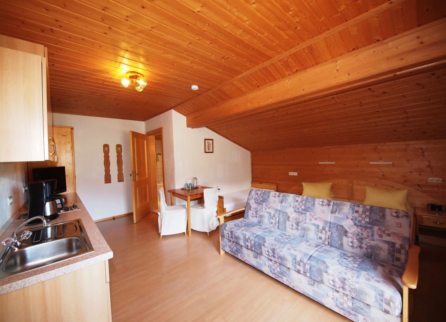 Entdecken Sie unser großzügiges und stilvoll eingerichtetes Apartment, perfekt für Familien oder kleine Gruppen von 4 bis 6 Personen. Auf 60 m² Wohnfläche erwartet Sie ein Ambiente voller Komfort und Gemütlichkeit. Das Apartment verfügt über zwei getrennte Schlafzimmer, jedes ausgestattet mit einem komfortablen Kingsize-Bett, die erholsame Nächte versprechen. Für weitere Gäste bieten zwei hochwertige Schlafsofas zusätzlichen Platz. Ein geräumiges Badezimmer mit Badewanne lädt zum Entspannen ein. Die voll ausgestattete Küche mit Kochfeld, Backofen, Kühlschrank, Toaster und Wasserkocher ermöglicht Ihnen die Zubereitung eigener Mahlzeiten. Genießen Sie diese im gemütlichen Wohn- und Essbereich, der ausreichend Platz für gemeinsame Stunden bietet. Zur Unterhaltung stehen Ihnen zwei Fernseher zur Verfügung. Ein besonderes Highlight ist der private Balkon mit atemberaubendem Blick nach Westen auf eine herrliche Bergkulisse. Hier können Sie die frische Bergluft und unvergessliche Sonnenuntergänge genießen.