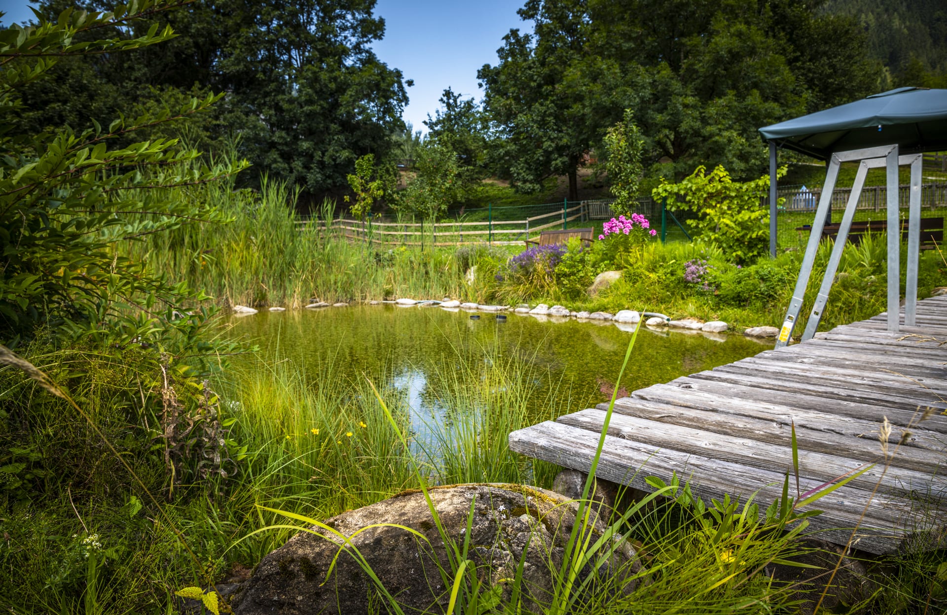 Zu den Annehmlichkeiten gehören eine Sauna im Garten mit Liegestühlen, Schwimmteich, Spielplatz und Spielraum für die Kinder.