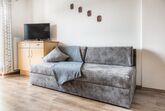 Es verfügt über zwei separate Schlafzimmer: eines mit einem gemütlichen Doppelbett und einem zusätzlichen Schlafsofa für eine Person und einem eigenen Fernseher, sowie ein zweites Schlafzimmer mit zwei komfortablen Einzelbetten.
