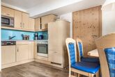 Der Wohnbereich lädt mit einer voll ausgestatteten Küche und Sofa zum Verweilen ein.