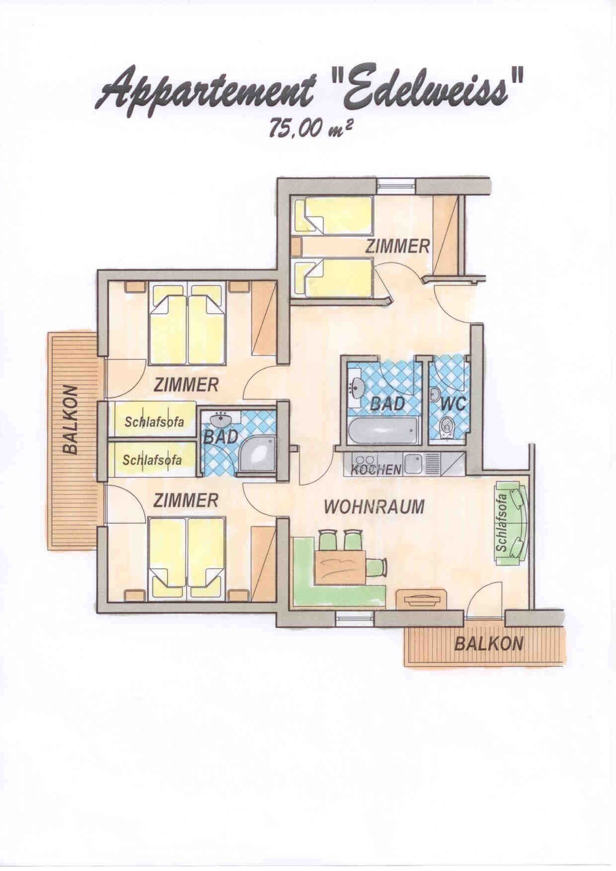 Unsere geräumige Nichtraucher-Ferienwohnung mit ca. 80 m² bietet die ideale Unterkunft für größere Familien oder Gruppen von bis zu 8 Personen.