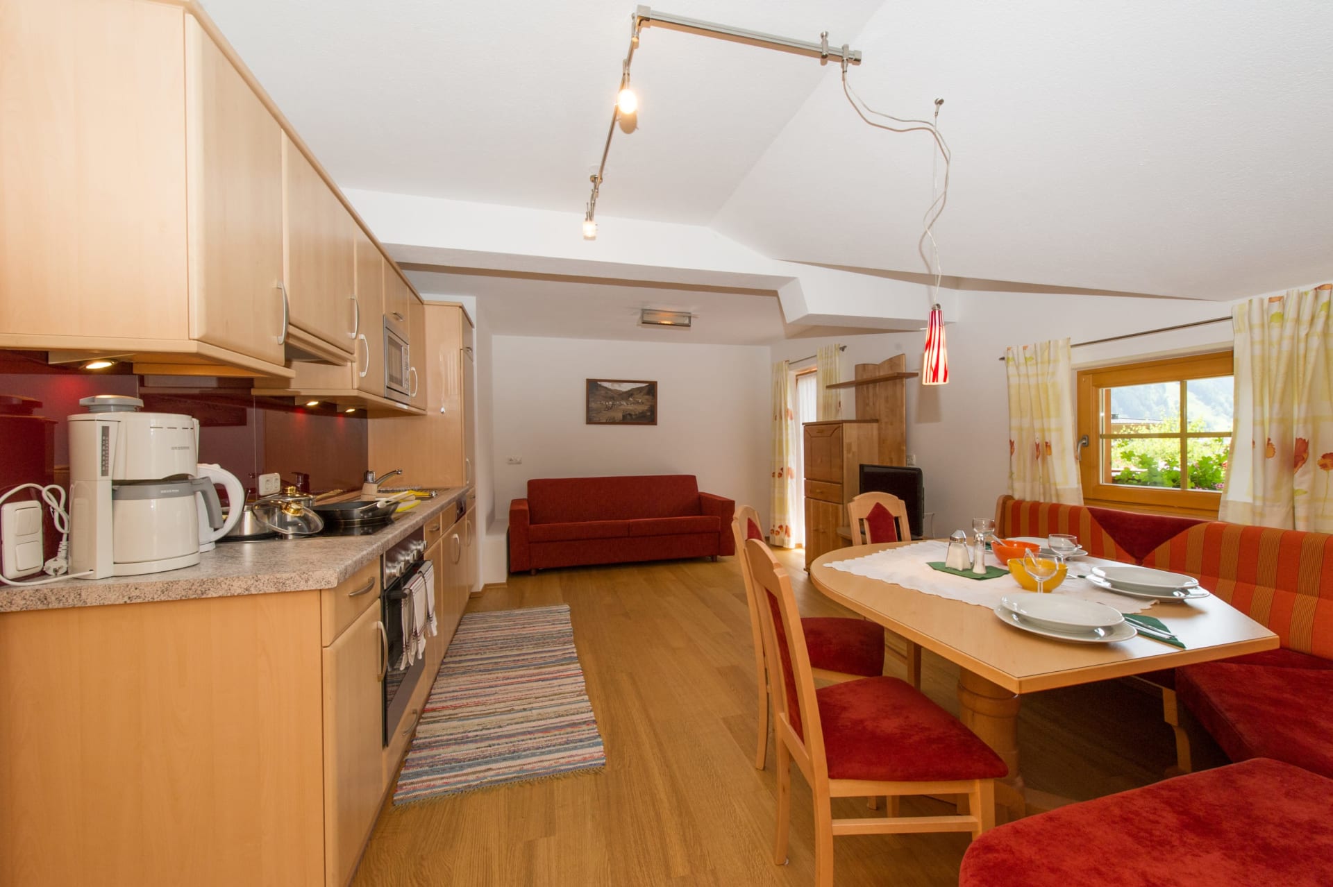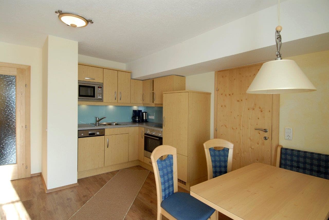 Der helle und einladende Wohnraum lädt zum Verweilen ein und ist ebenfalls mit einem Fernseher ausgestattet. Die voll ausgestattete Küche mit Herd, Geschirrspüler, Mirowelle, Kühlschrank und umfassender Küchenausstattung ermöglicht Ihnen die flexible Selbstversorgung.