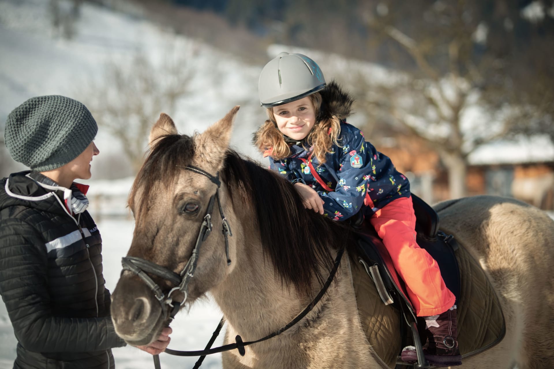 Ein Reitausflug im Winter ist eine besonders tolle Geschichte, sowie lustige Stunden mit den Ponys und den anderen Tieren im Stall. Mit dem Schlitten und der Rodel könnt ihr direkt ab Hof losstarten. So wie mit den Langlaufskiern, eine Loipe führt direkt bei uns vorbei.