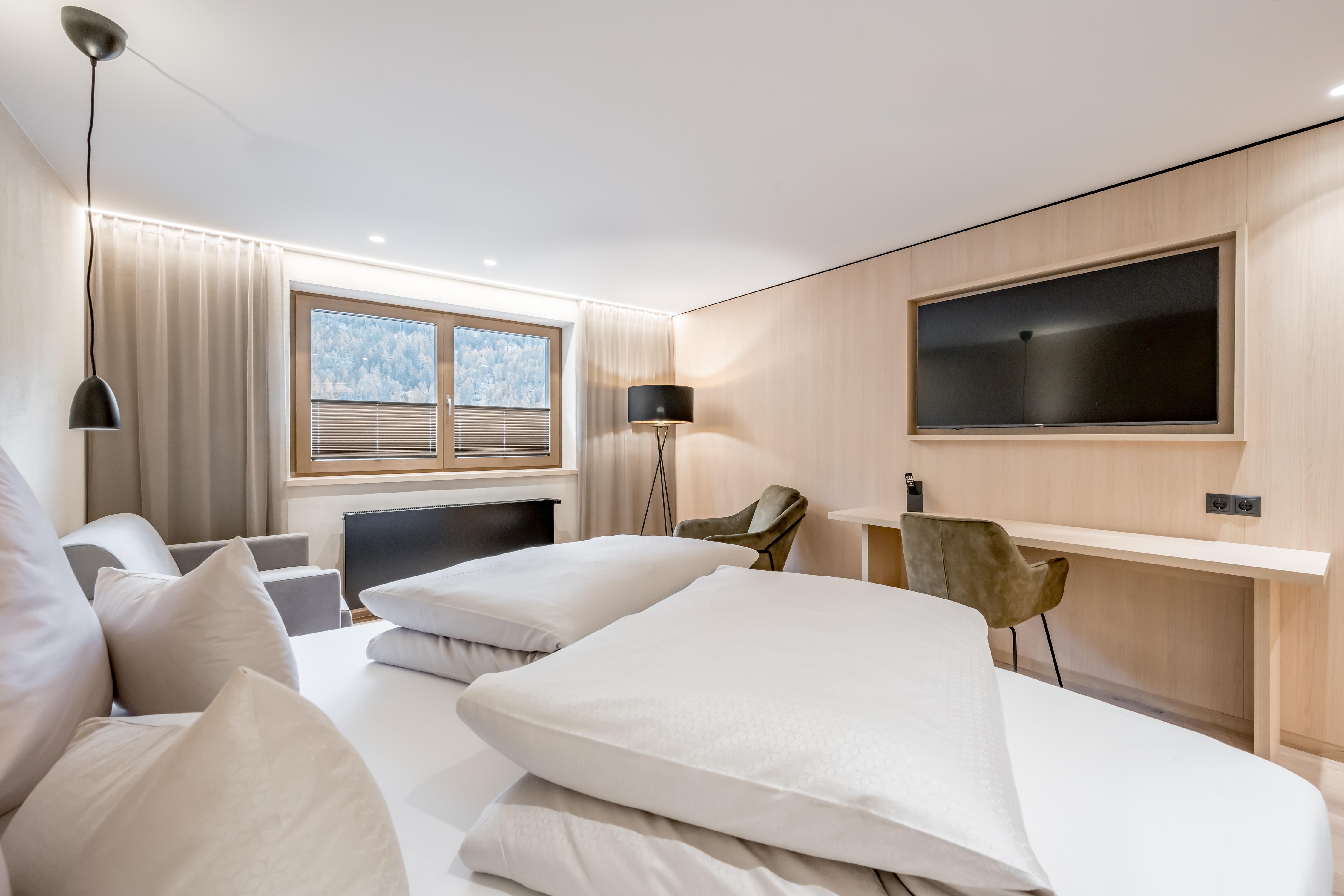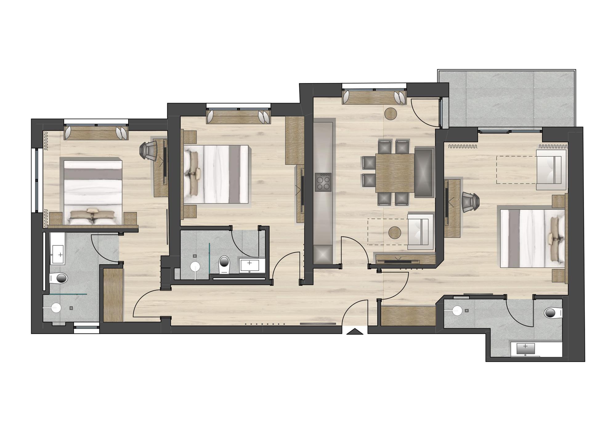Das Appartement Top 2 im 1. Stock, bietet auf etwa 95 m² viel Raum und Komfort für bis zu 7 Personen, ideal für größere Familien oder Freunde. Es umfasst drei Schlafzimmer (ein Schlafzimmer mit einem Schlafsofa - Schlafmöglichkeit für die 7. Person) mit Flat-TV, jedes mit eigenem Badezimmer inklusive Dusche und WC. Die modern eingerichtete Wohnküche ist voll ausgestattet und verfügt über einen großen, gemütlichen Essbereich, ein Sofa und einen weiteren Flat-TV. Vom Süd-Ost-Balkon aus lässt sich ein herrlicher Ausblick genießen. Dieses großzügige und komfortable Appartement ist perfekt für diejenigen, die ein geräumiges und gut ausgestattetes Feriendomizil suchen.
