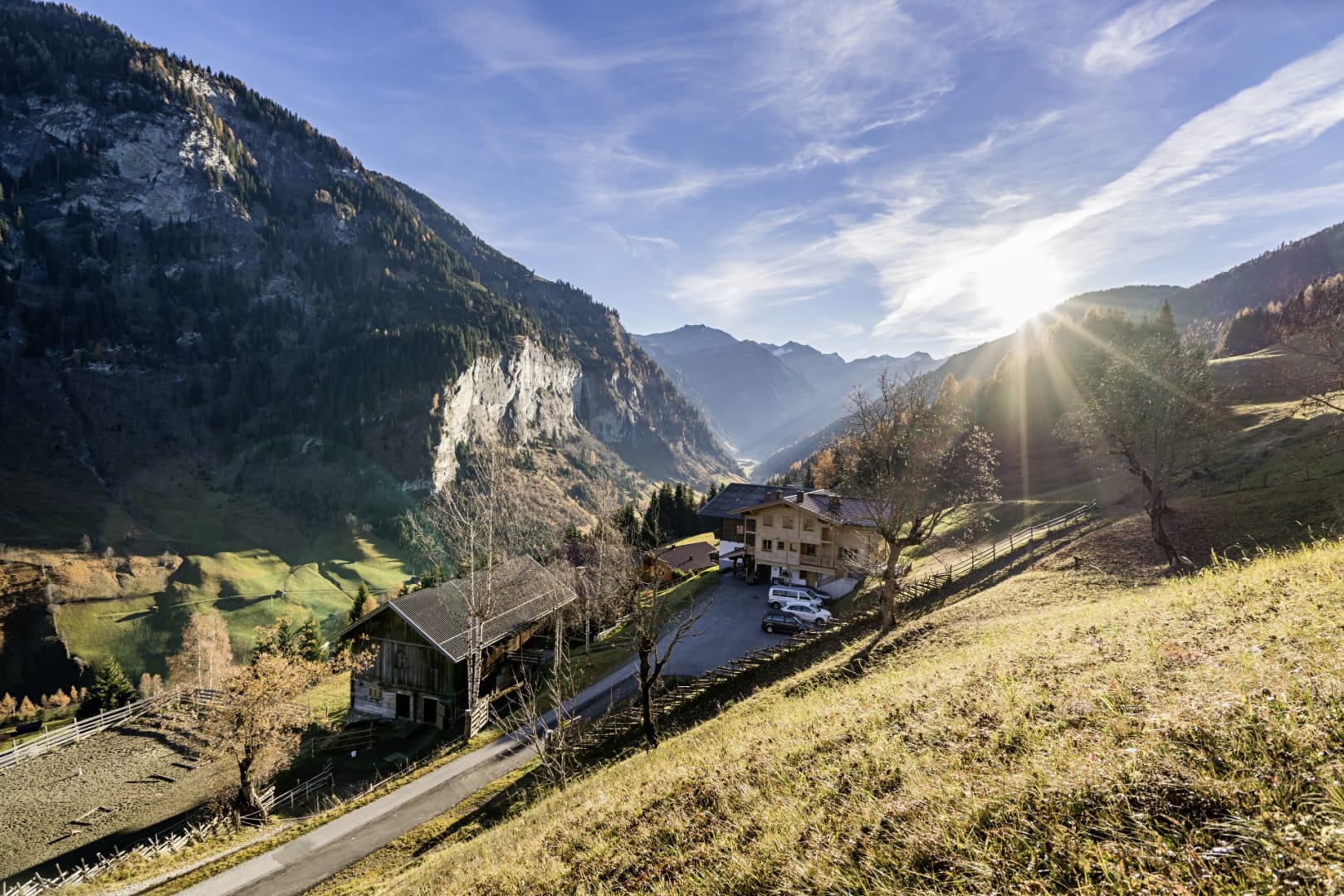 Genießen Sie den atemberaubenden Blick auf das malerische Großarltal und die imposanten Gebirgsketten der Hohen Tauern. Auf 1.130 m Seehöhe werden Sie von der wilden, romantischen Schönheit der Natur verzaubert. Unsere modernen Holzhäuser, die 2003 und 2014 in nachhaltiger Bio-Blockbauweise errichtet wurden, bieten Ihnen höchsten Komfort für einen erholsamen Urlaub. Vom Balkon aus können Sie die spektakuläre Aussicht auf die verschneiten Gebirgszüge und die umliegenden Wasserfälle genießen.