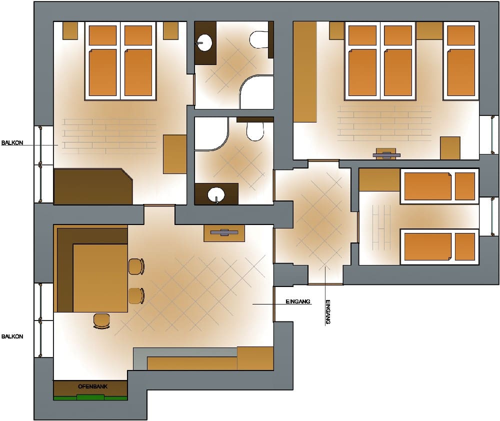 • zwei Dreibettzimmer mit jeweils Dusche/WC, ein Zweibettzimmer