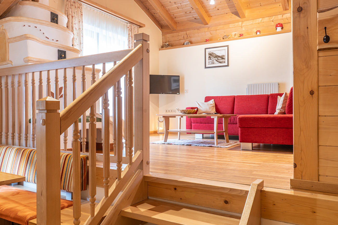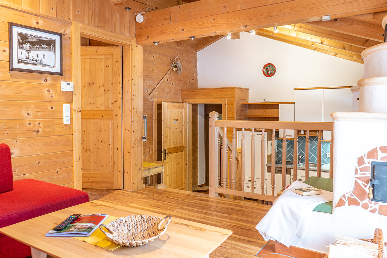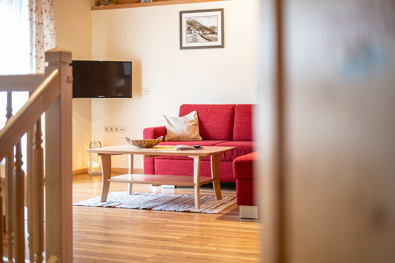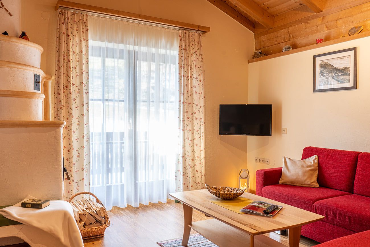 Die Ferienwohnung „Penkopf“ (46 m²) ist ausgestattet mit Gesundheits-Vollholzmöbeln, Küche mit kompletter Küchenzeile und Essecke, Wohnbereich mit Holzkachelofen, Ausziehcouch, DU/WC mit Haarfön, Kabel-Flat-TV, eigener Balkon, Schlafzimmer mit Doppelbett und Kinderbett.