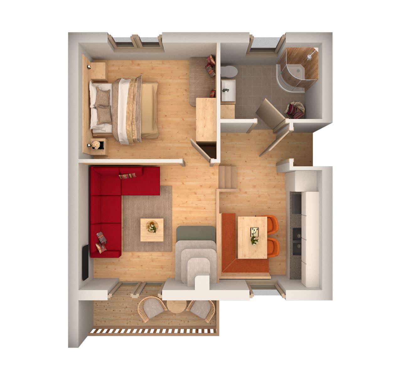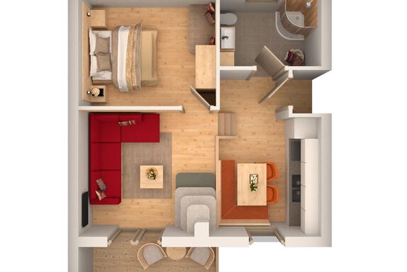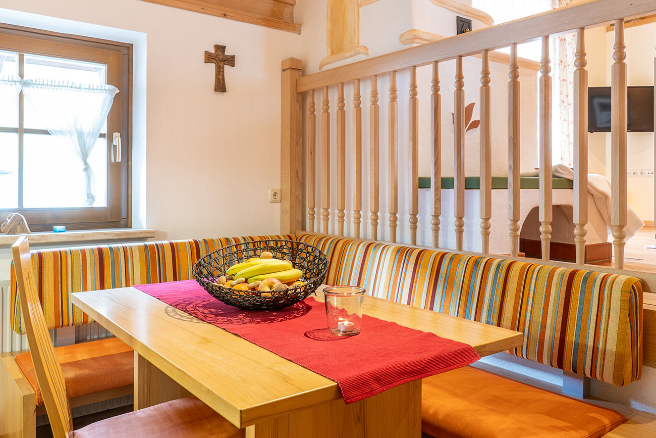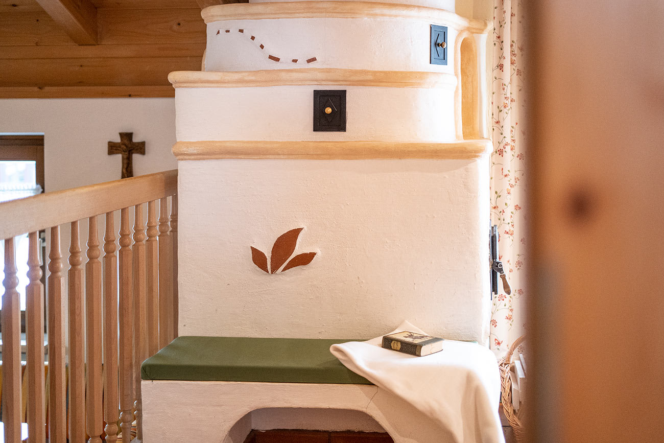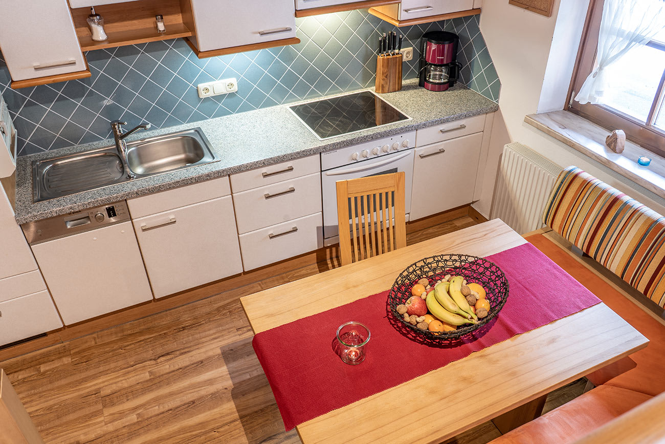 Die Ferienwohnung „Penkopf“ (46 m²) ist ausgestattet mit Gesundheits-Vollholzmöbeln, Küche mit kompletter Küchenzeile und Essecke, Wohnbereich mit Holzkachelofen, Ausziehcouch, DU/WC mit Haarfön, Kabel-Flat-TV, eigener Balkon, Schlafzimmer mit Doppelbett und Kinderbett.