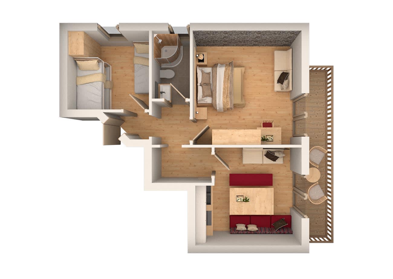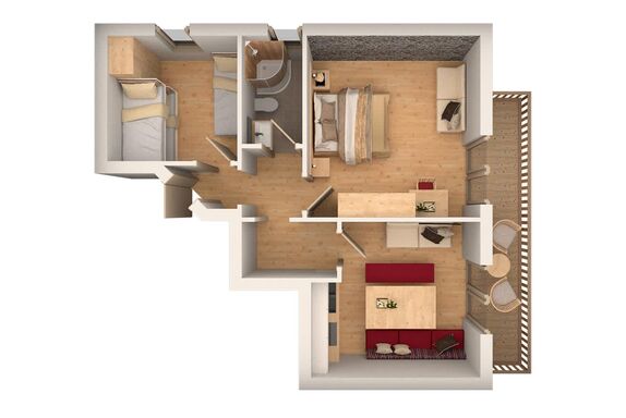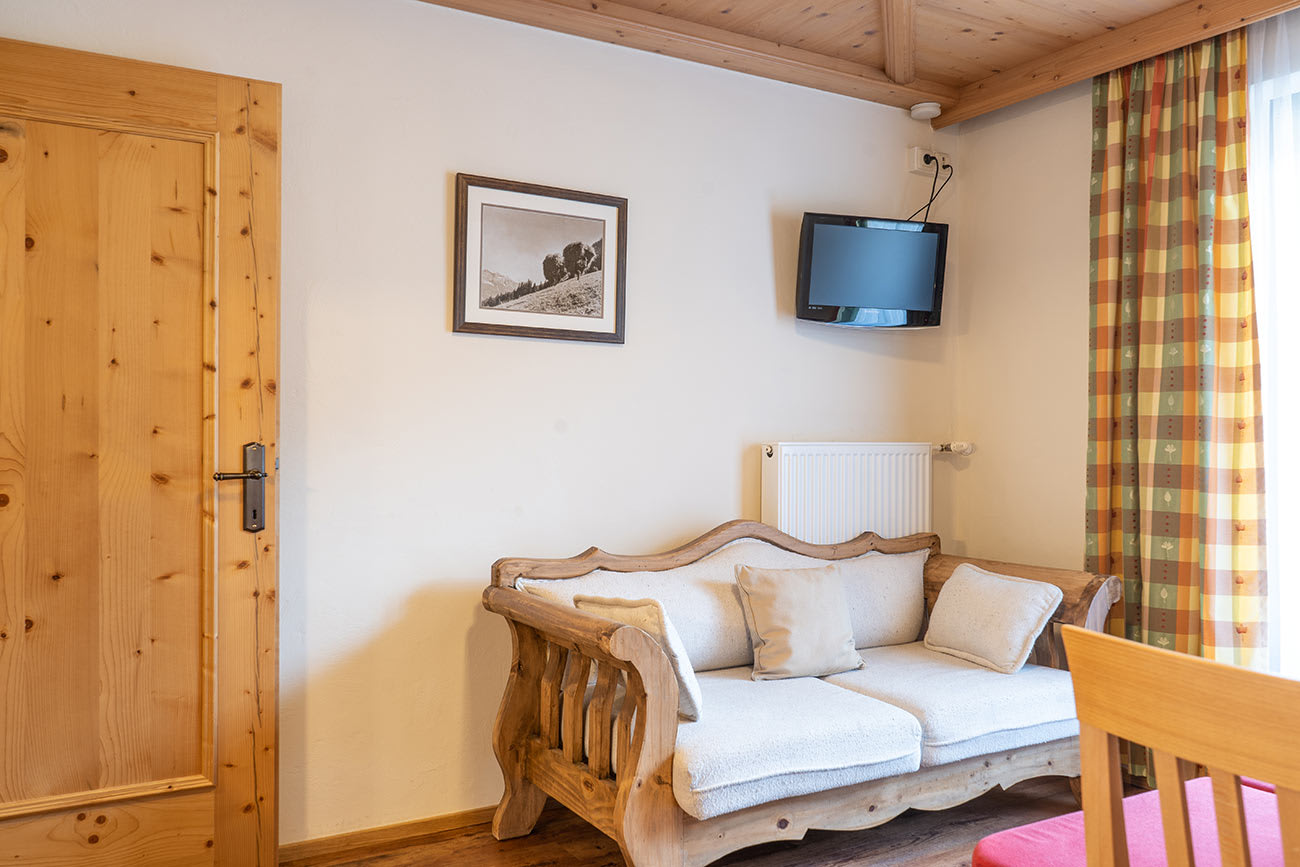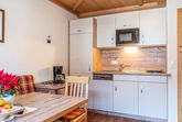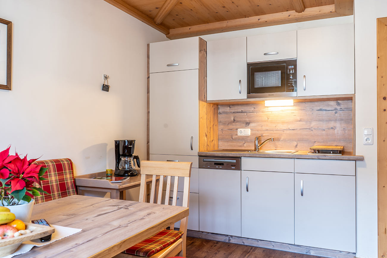 Ferienwohnung „Kitzstein“ ist ausgestattet mit Gesundheits-Vollholzmöbeln, Vorraum mit Garderobe, DU/WC mit Haarfön, Schlafzimmer mit einem Doppelbett und 1 Zusatzbett, Schlafzimmer mit Einzelbett und Stockbett, Wohnküche mit kompletter Küchenzeile, Couch, Essecke, Kabel-Flat-TV und eigenem Balkon.