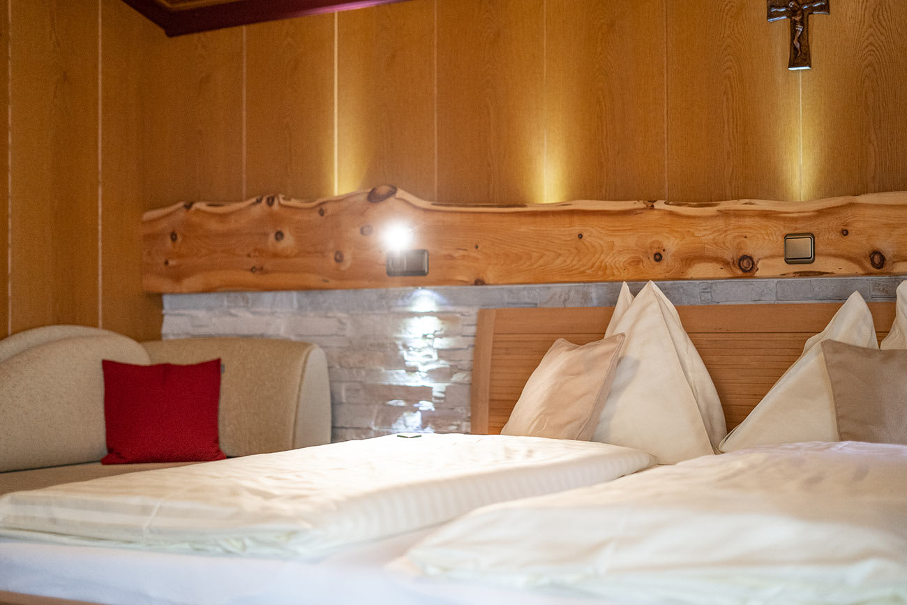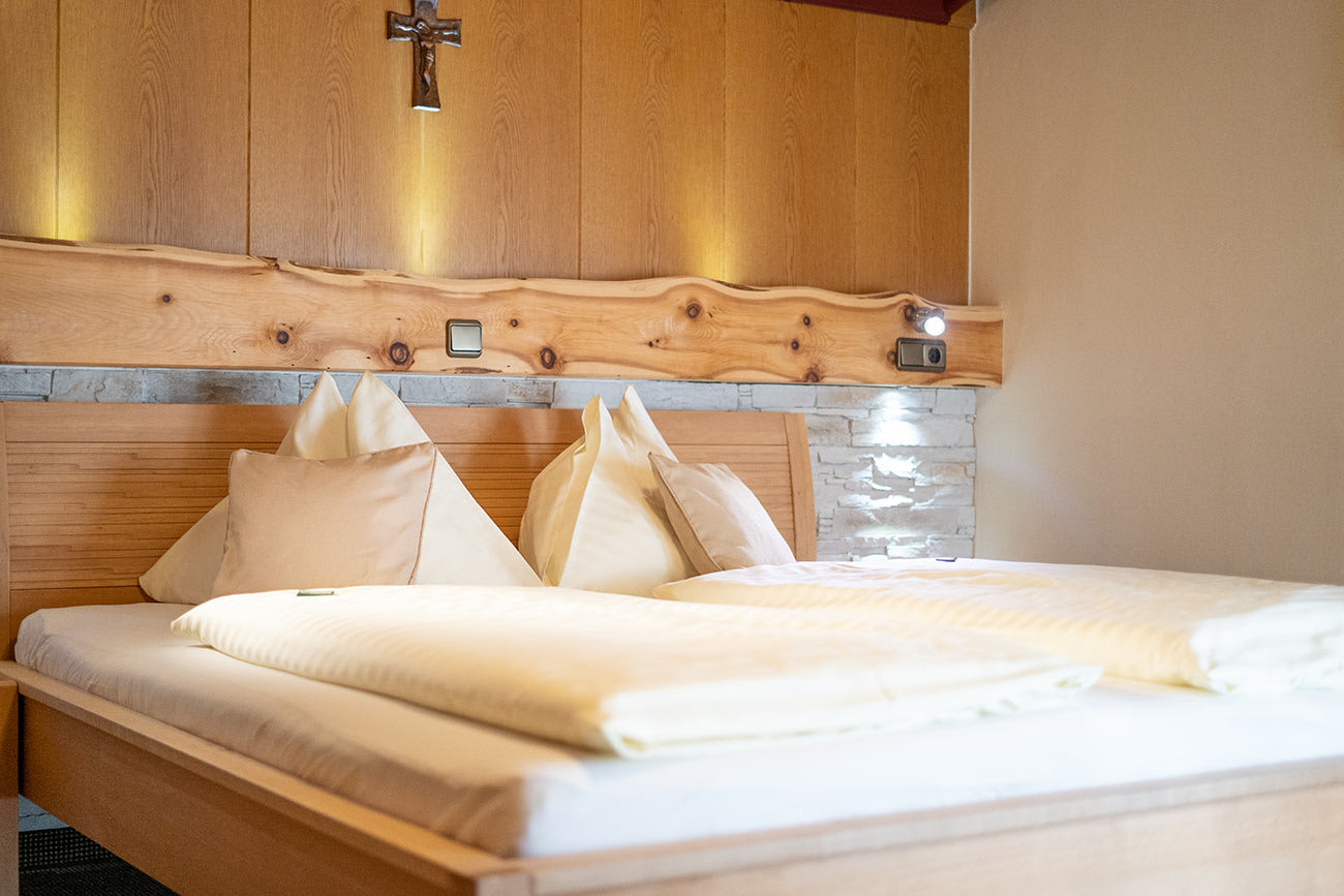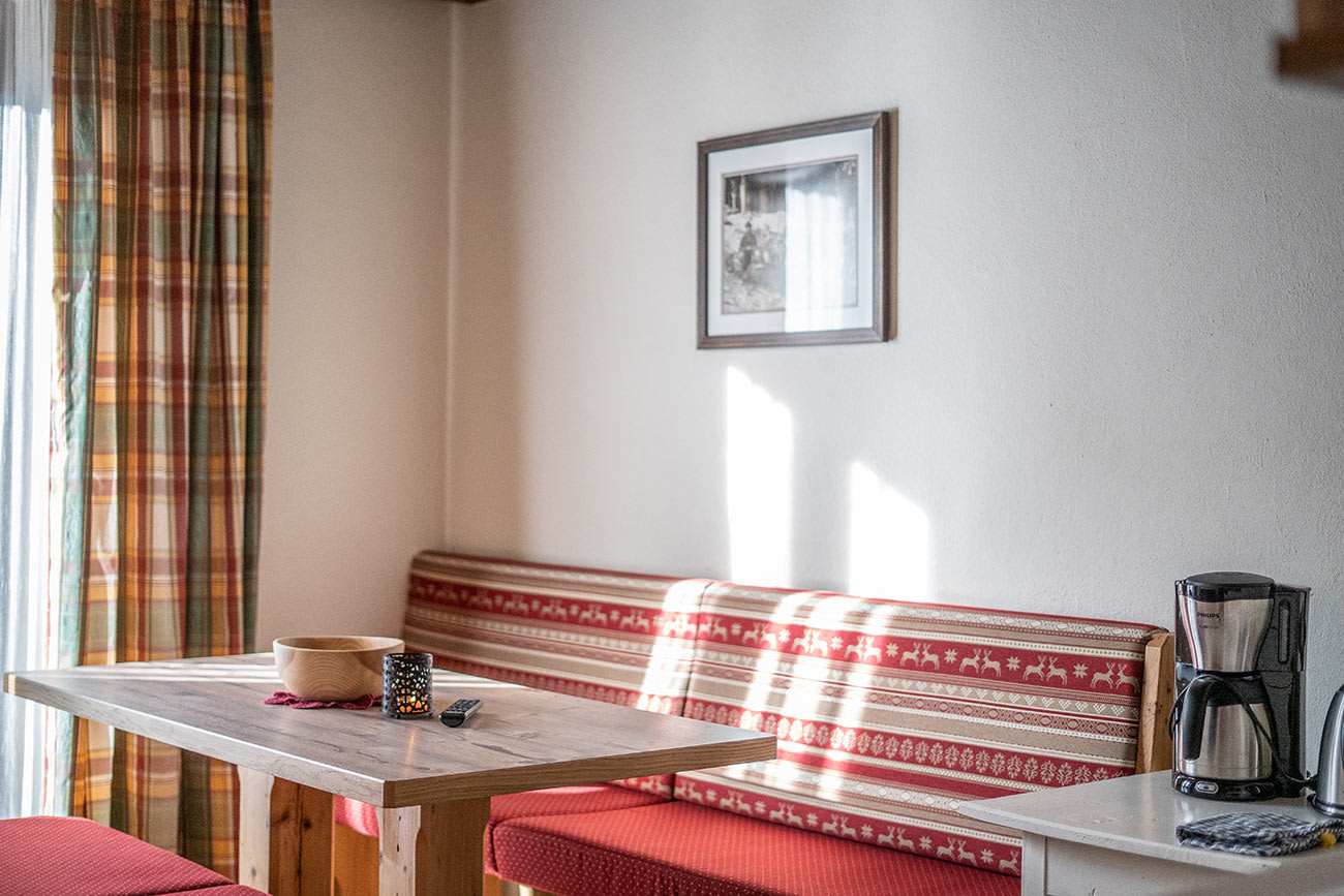 Die Ferienwohnung „Zirbeneck“ ist ausgestattet mit Gesundheits-Vollholzmöbeln, Vorraum mit Garderobe, DU/WC mit Haarfön, Schlafzimmer mit einem Doppelbett und 1 Zusatzbett, Wohnküche mit kompletter Küchenzeile, Couch, Essecke, Kabel-Flat-TV und eigenem Balkon.