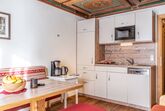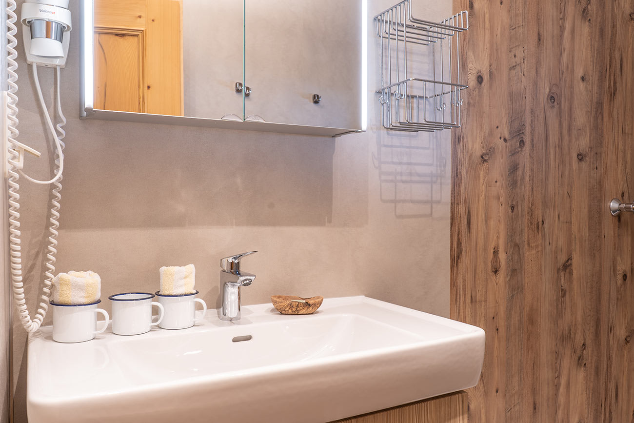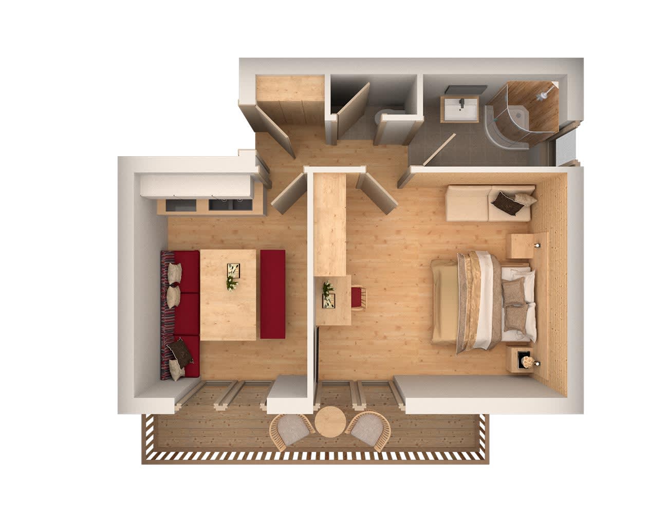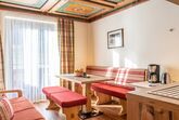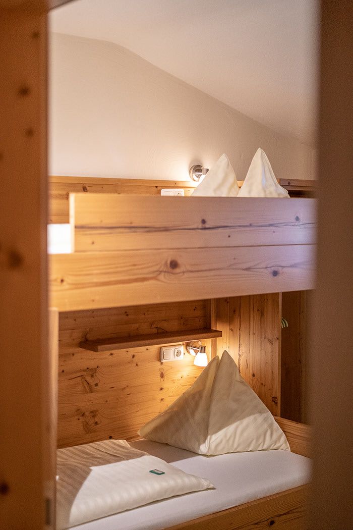 Die Ferienwohnung „Zirbeneck“ ist ausgestattet mit Gesundheits-Vollholzmöbeln, Vorraum mit Garderobe, DU/WC mit Haarfön, Schlafzimmer mit einem Doppelbett und 1 Zusatzbett, Wohnküche mit kompletter Küchenzeile, Couch, Essecke, Kabel-Flat-TV und eigenem Balkon.