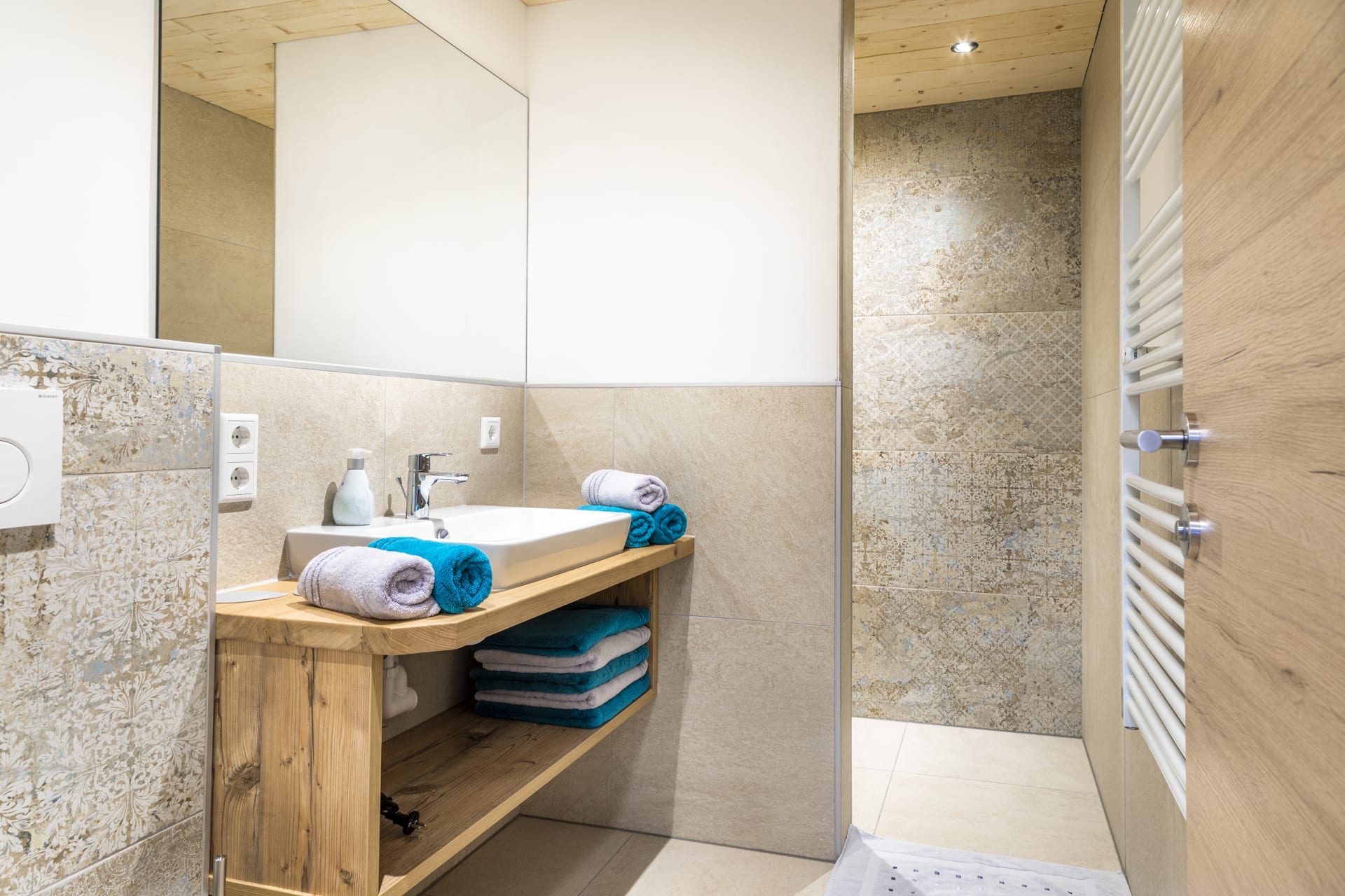 Einen herrlichen Ausblick genießen Sie von unserer neu gestalteten Ferienwohnung „Aussicht“, die mit 52 m² Platz für bis zu 7 Personen bietet. Die modern, rustikal gestaltete Wohnung besteht aus einem Schlafzimmer für zwei Personen mit Doppelbett, einem Schlafzimmer für drei Personen mit einem Einzelbett und einem Stockbett und einem Wohnbereich mit Ausziehcouch und Schlafmöglichkeit für zwei Personen. Die Ferienwohnung ist mit einem Badezimmer mit Dusche und Toilette sowie einer weiteren separaten Toilette ausgestattet. Die Küche im Wohnbereich bietet einen Elektroherd, Backofen, Mikrowelle, Kaffeemaschine, Wasserkocher, Toaster und auch eine Geschirrspülmaschine. Den wunderschönen Ausblick auf den Hochkönig und in Richtung Bischofshofen genießen Sie am besten direkt vom Balkon.