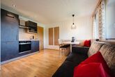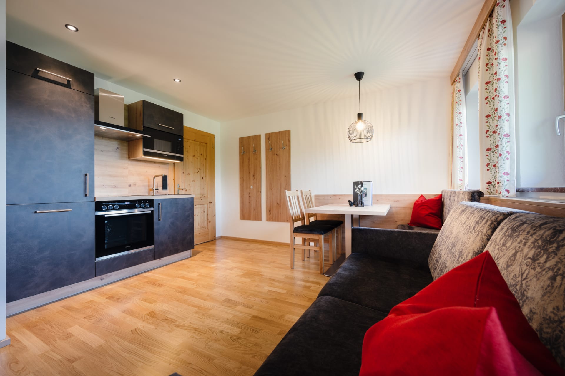 • 1 Wohnküche mit modernen Küchengeräten, Esstisch sowie ausziehbarer Doppelcouch