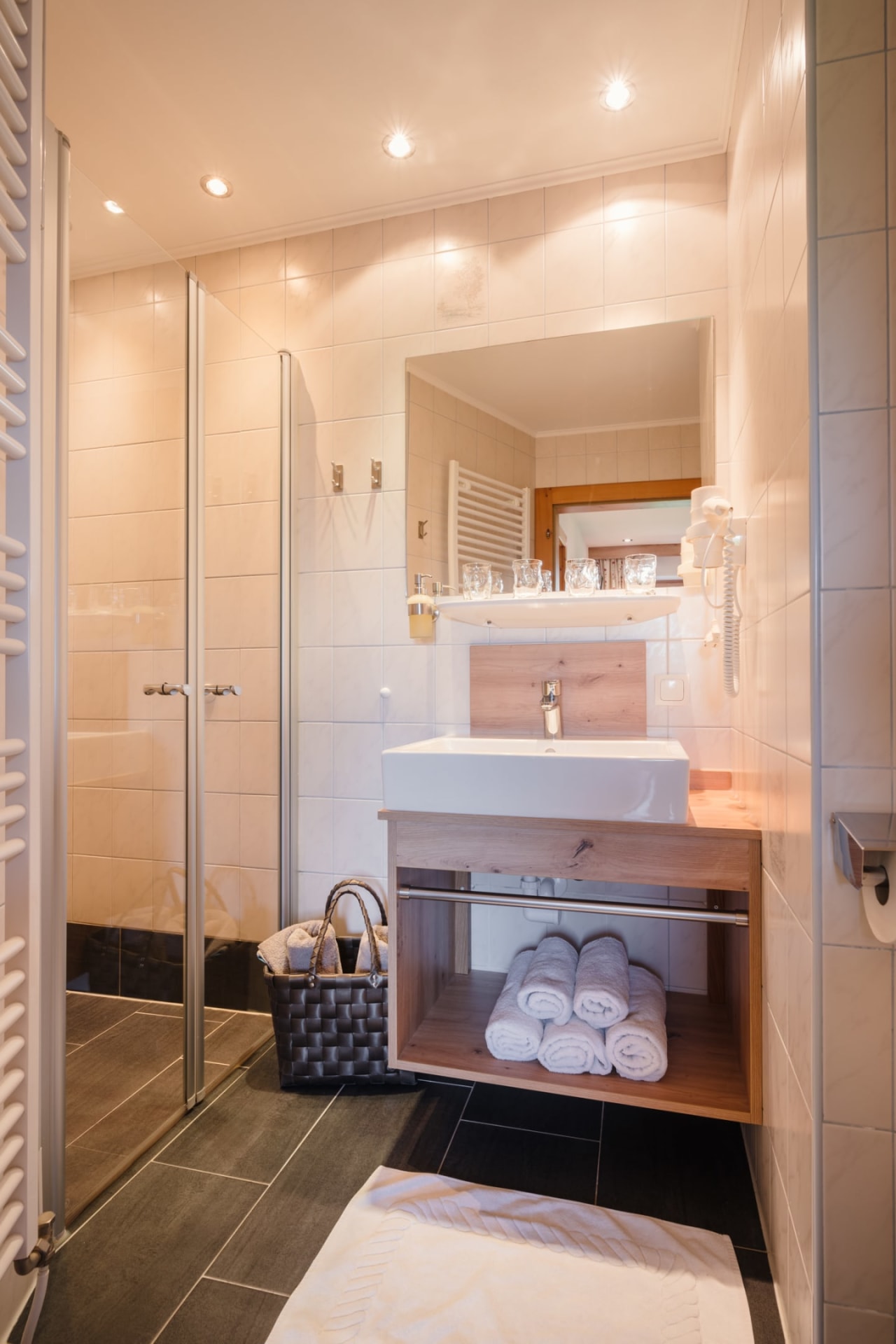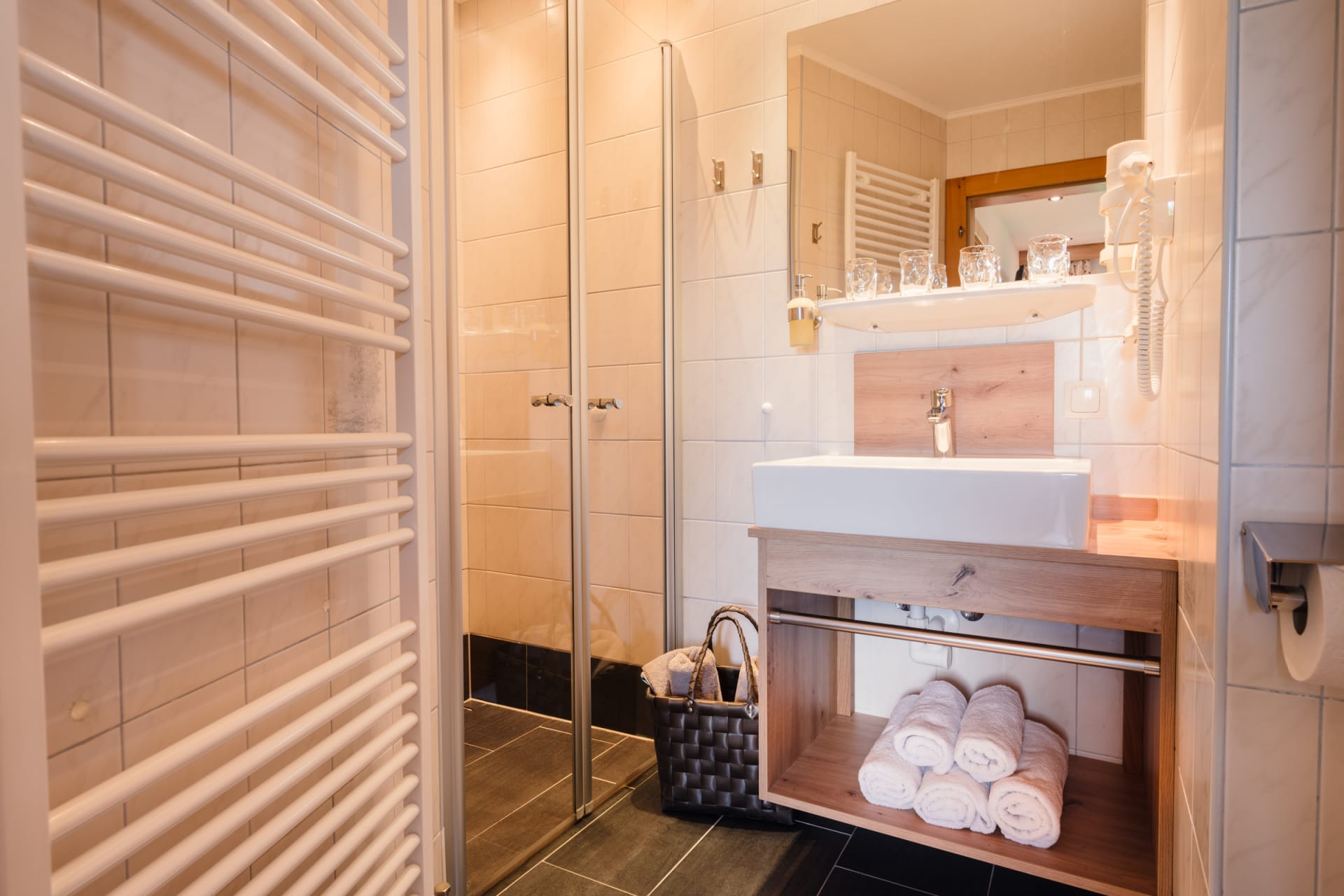 • 1 Badezimmer mit Waschtisch, Dusche/WC und Haarfön