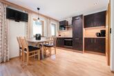 • 1 Wohnküche mit modernen Küchengeräten, Esstisch sowie ausziehbarer Doppelcouch