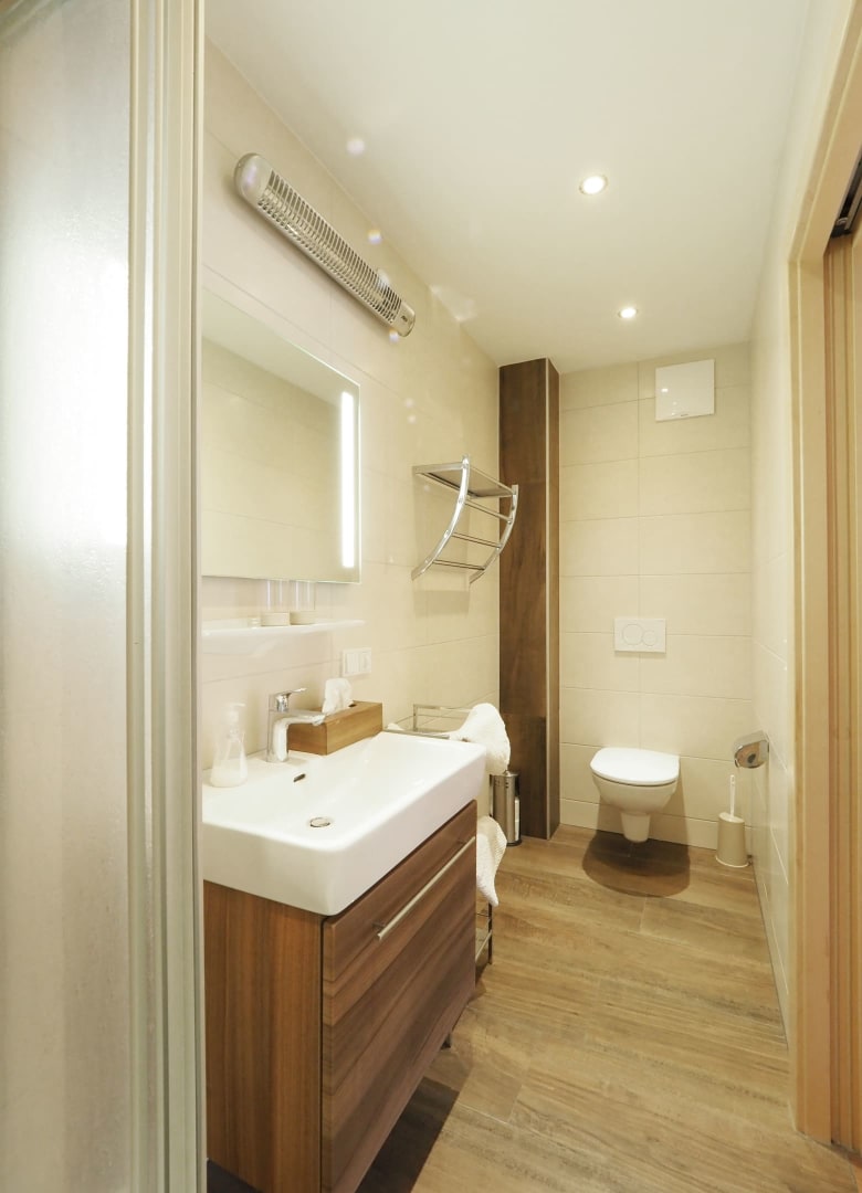 • Modernes Bad mit 2 Waschbecken und Waschmaschine, Toilette separat