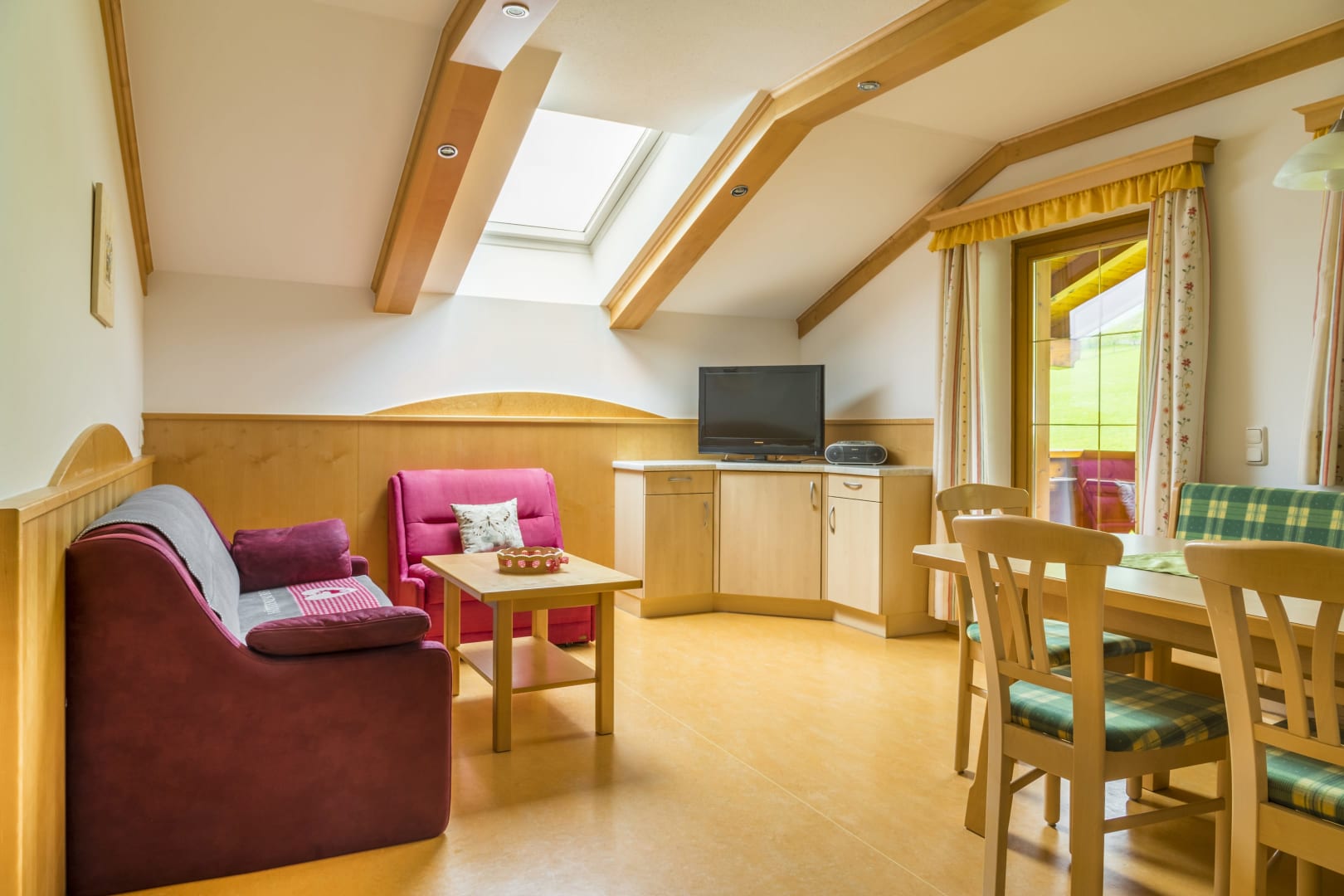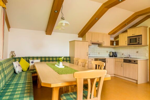 Wohnküche mit großzügiger Sitzecke, gehobene Ausstattung (Geschirr, Besteck und Gläser für ca. 12 Personen); 2 getrennte Schlafzimmer. Eigener Südbalkon mit Bergblick.