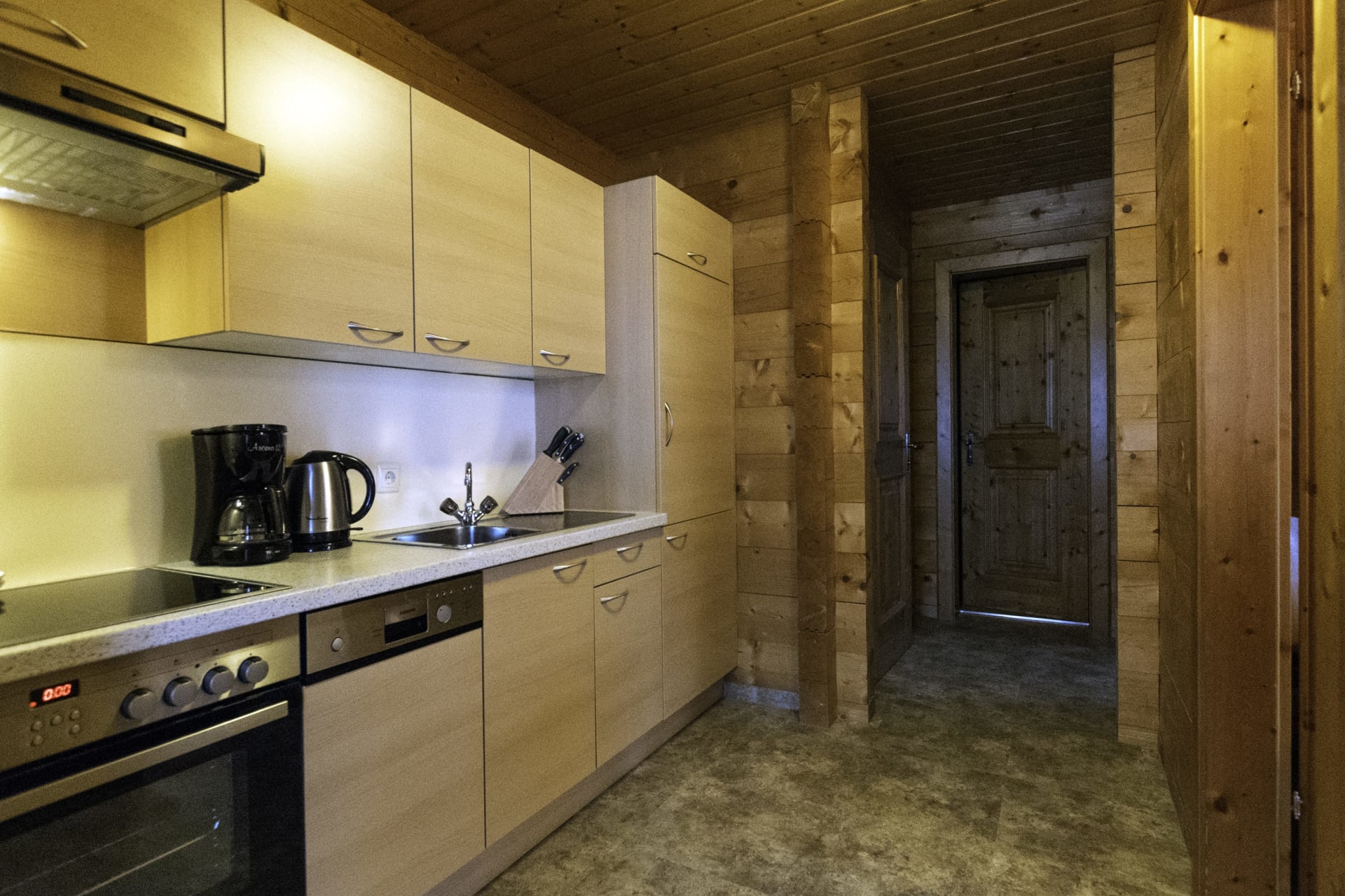 • Küchenzeile mit umfangreicher Ausstattung (E-Herd mit Backrohr, Geschirrspülmaschine, Kaffemaschine, Wasserkocher, Kühlschrank mit Tiefkühlfach, Dunstabzug, Geschirr und Kochtöpfe, Microwelle)