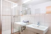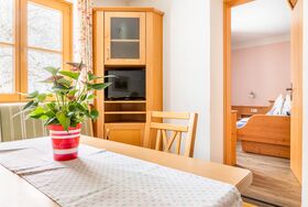 Große neu eingerichtete Ferienwohnung (2 getrennte Schlafzimmer) mit hellen Vollholzmöbeln, Kleiderschrank, Schreibtisch, großer Spiegel, freundlich ausgemalt (rosa). Geräumige Küche mit Eckbank, Küchenblock, voll ausgestattet mit Geschirr, Kühlschrank, E-Herd, Dustabzug, Backrohr, Kaffeemaschine, Wasserkocher, Eierkocher, Toaster. Balkon auf Ostseite (Sonnenaufgang), Großes Badezimmer mit Doppelwaschbecken und Riesendusche, WC extra. W-LAN, und Sat-TV