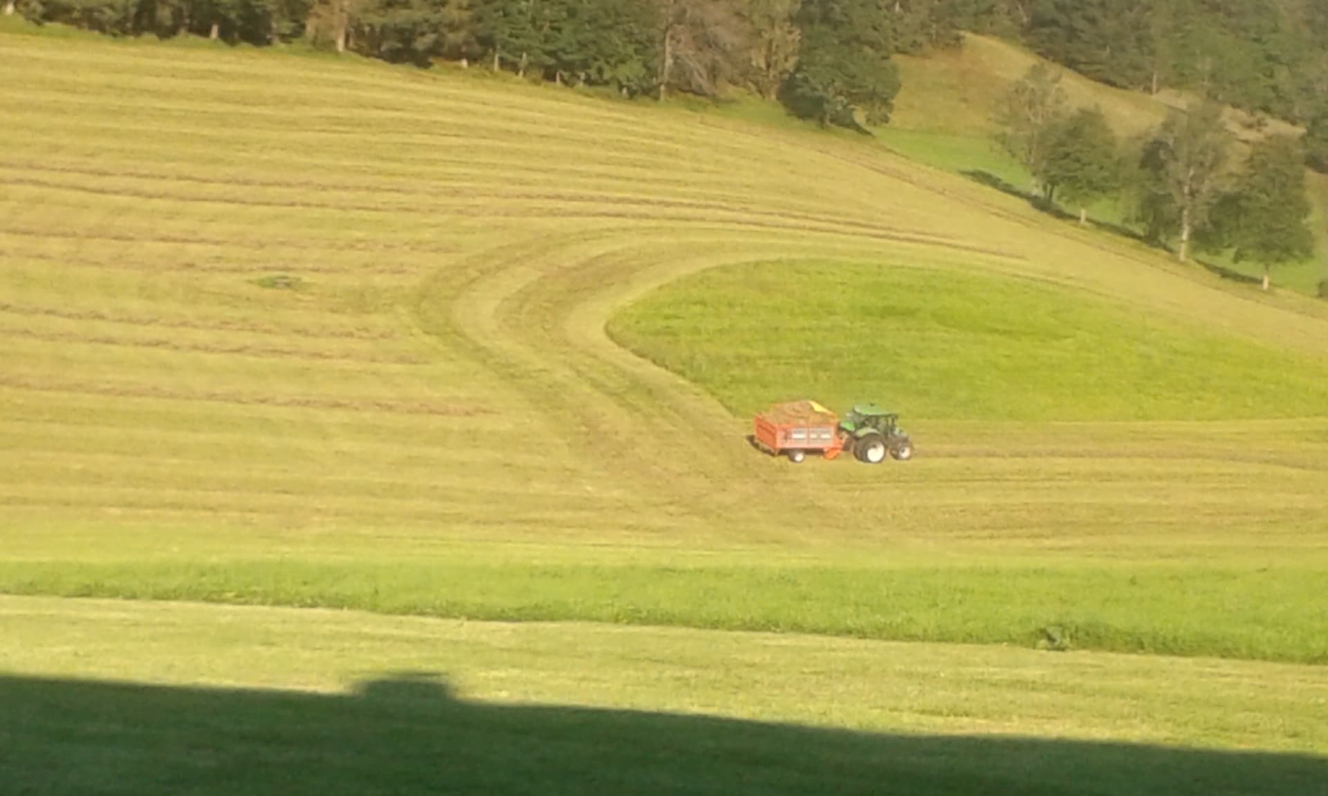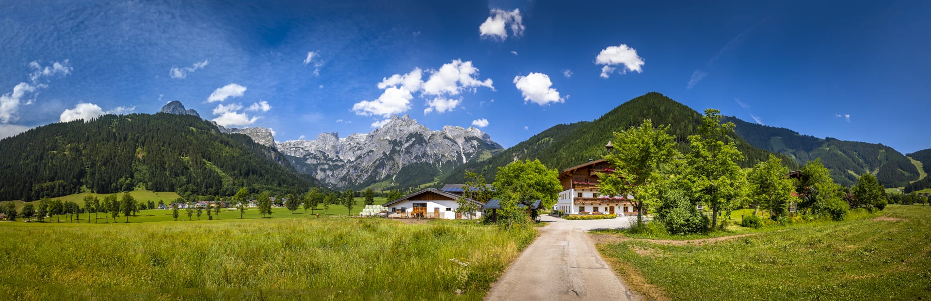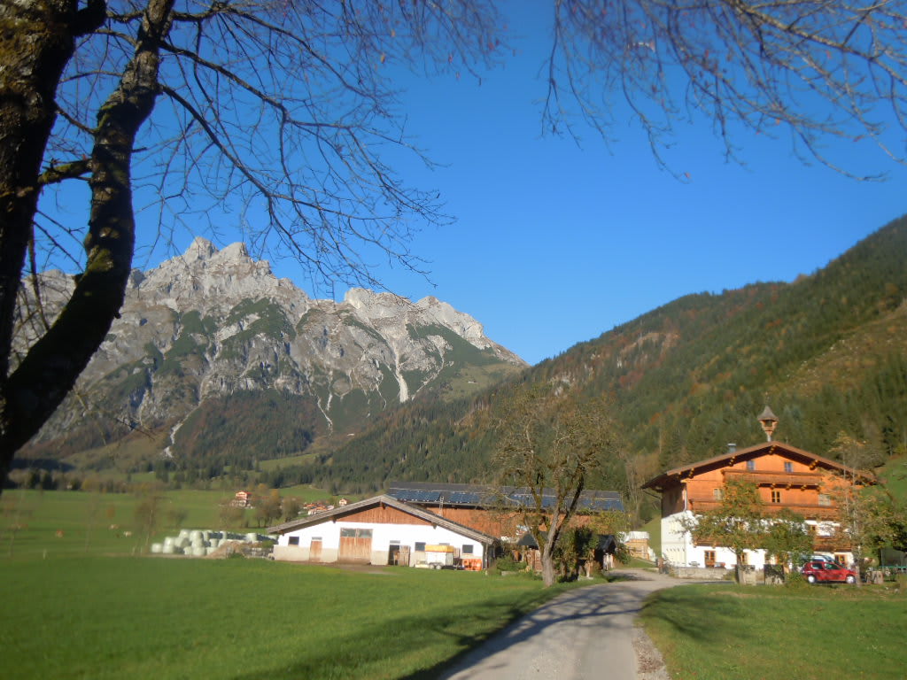 Unser Bio-Bauernhof liegt sonnig und ruhig inmittten von Wiesen und umgeben von einer beeindruckenden Bergkulisse.
