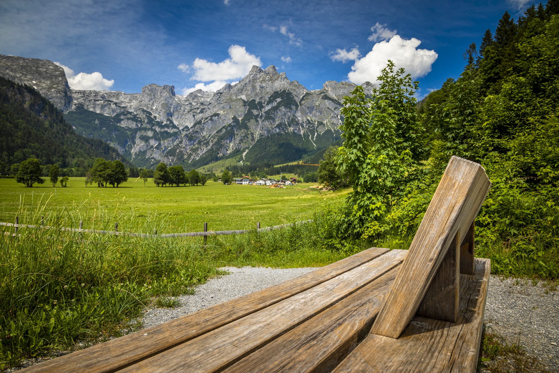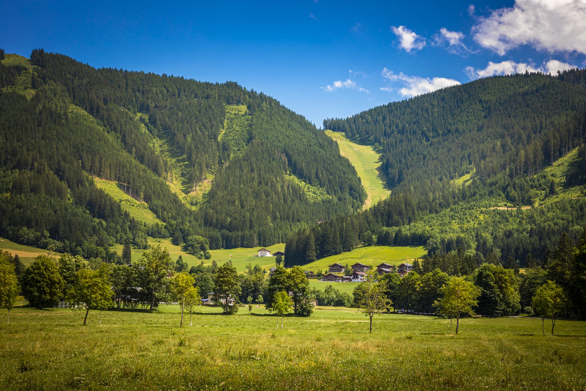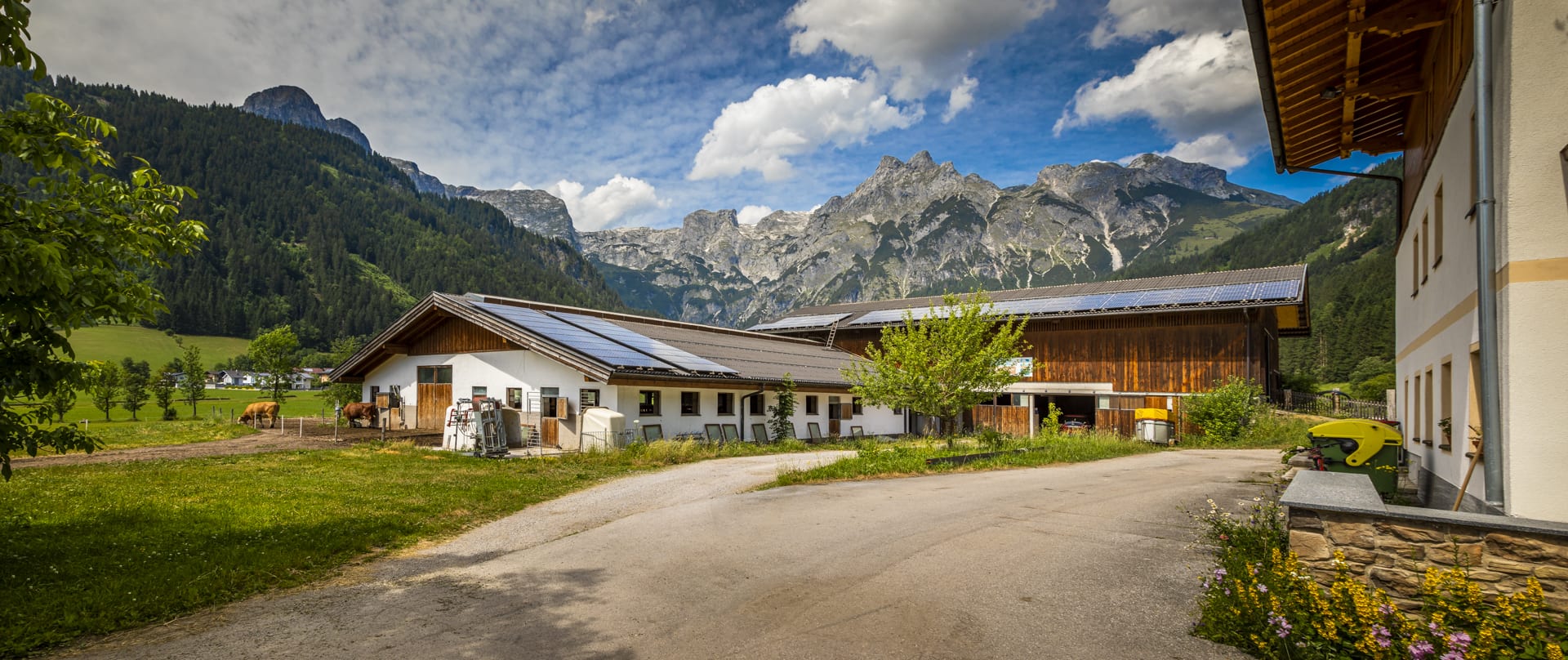 Unser Bio-Bauernhof liegt sonnig und ruhig inmittten von Wiesen und umgeben von einer beeindruckenden Bergkulisse.