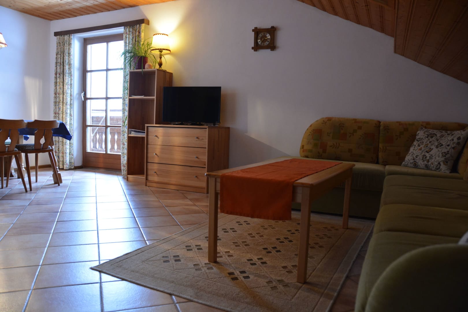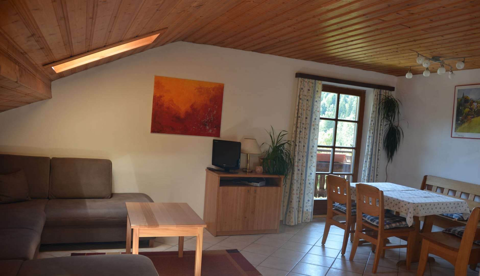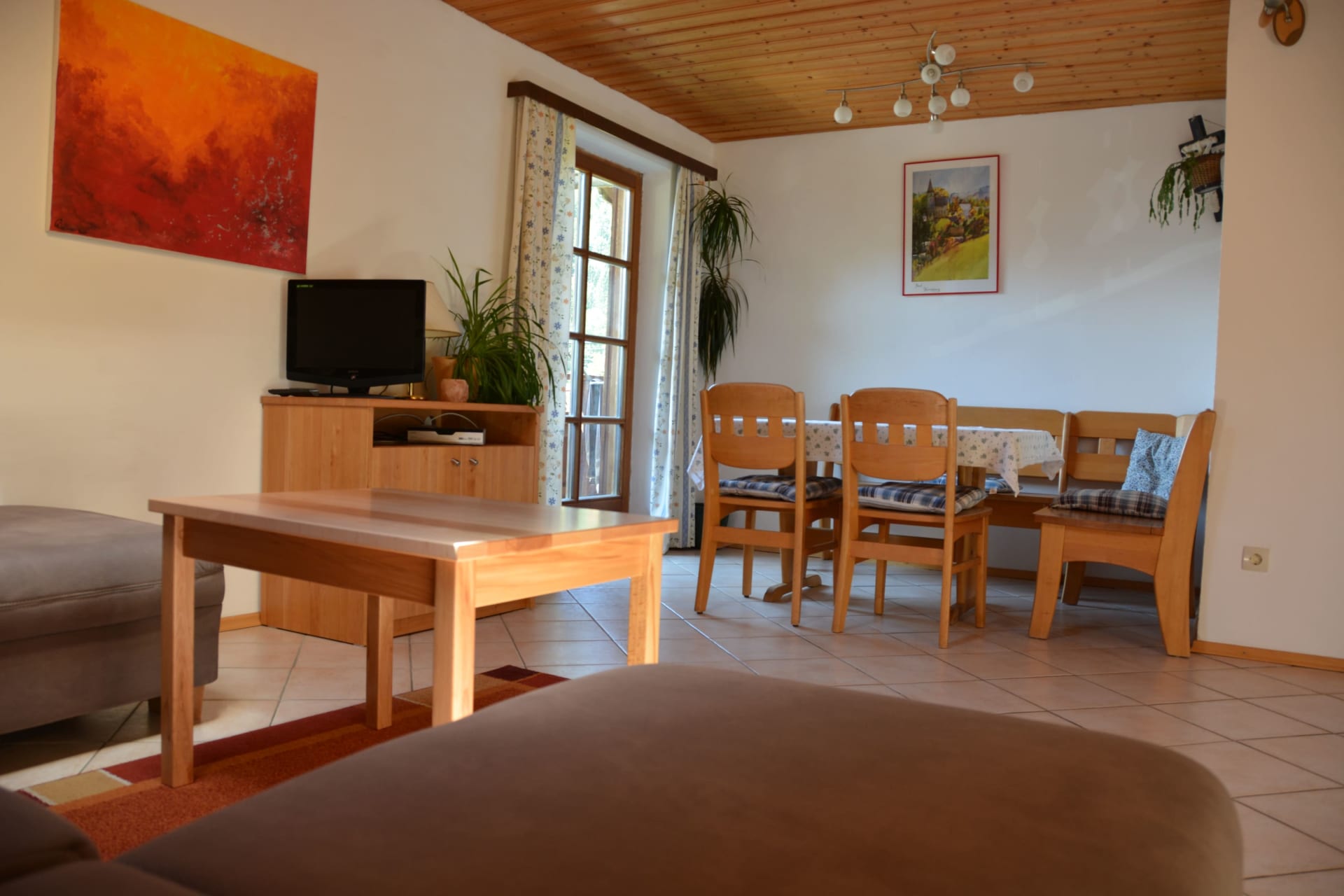 Willkommen in der Blumenwiesen-Wohnung: Ihrem stilvollen Almidyll. Diese Ferienwohnung, mit großzügigen 65 m² ist ideal für bis zu 4 Personen. Beginnen Sie jeden Tag auf dem sonnigen Südbalkon und lassen Sie sich von einem atemberaubenden Panoramablick auf die majestätische Bergwelt und den blühenden Garten verzaubern. Dies ist der perfekte Ort für genussvolle Morgenkaffees oder unvergessliche Sonnenuntergänge. Im offenen Wohnbereich lädt eine bequeme Wohnlandschaft, ausgestattet mit einem Fernseher, zum Entspannen nach ereignisreichen Tagen ein. Die moderne, voll ausgestattete Küche lässt keine kulinarischen Wünsche offen: Mit Cerankochfeld, Backofen, Mikrowelle, Geschirrspüler, großem Kühlschrank sowie Kaffeemaschine, Wasserkocher und Toaster bereiten Sie Ihre Lieblingsmahlzeiten mühelos zu. Die gemütliche Essecke bietet ausreichend Platz für gemeinsame Mahlzeiten und angeregte Gespräche. Für einen erholsamen Schlaf sorgen zwei liebevoll gestaltete Schlafzimmer. Ein Gitterbett steht für unsere jüngsten Gäste bereit. Das elegante Badezimmer, gestaltet mit edlem Naturstein und wohliger Fußbodenheizung, verwöhnt Sie mit einer geräumigen, ebenerdigen Dusche und einem praktischen Handtuchtrockner – pure Entspannung und Frische nach jedem Abenteuer. Dank kostenfreiem WLAN bleiben Sie auch im Urlaub bestens verbunden und können Ihre Erlebnisse teilen. Ihr vierbeiniges Familienmitglied ist in unserer Wohnung herzlich willkommen und darf die Urlaubsfreude mit Ihnen teilen. Bettwäsche ist selbstverständlich inklusive und bei Ihrer Ankunft bereits bezogen. Für das ultimative Verwöhnerlebnis können Sie unseren exklusiven privaten Wellnessbereich mit Sauna und Infrarotkabine dazubuchen – der ideale Abschluss für aktive Tage in der Natur. Die Wohnung ist mehr als nur eine Unterkunft; sie ist Ihr stilvolles Domizil für unvergessliche Momente in den Bergen, wo Komfort, Natur und Herzlichkeit aufeinandertreffen. Buchen Sie jetzt Ihren Traumurlaub.