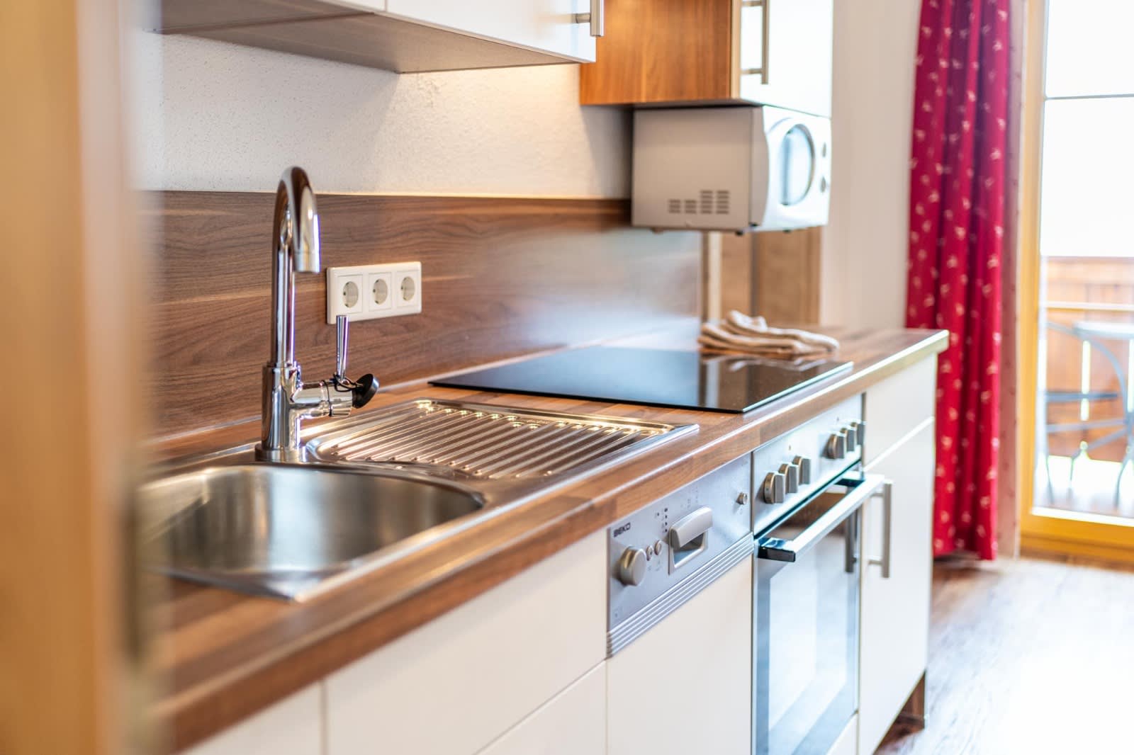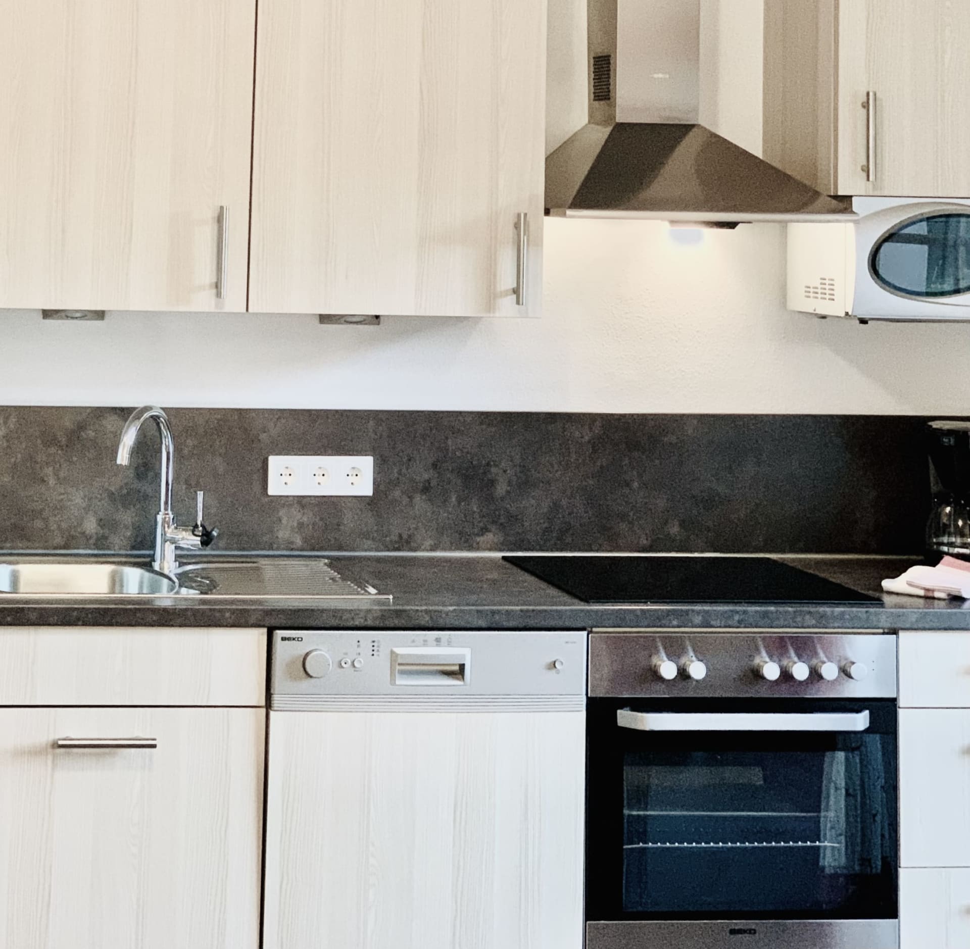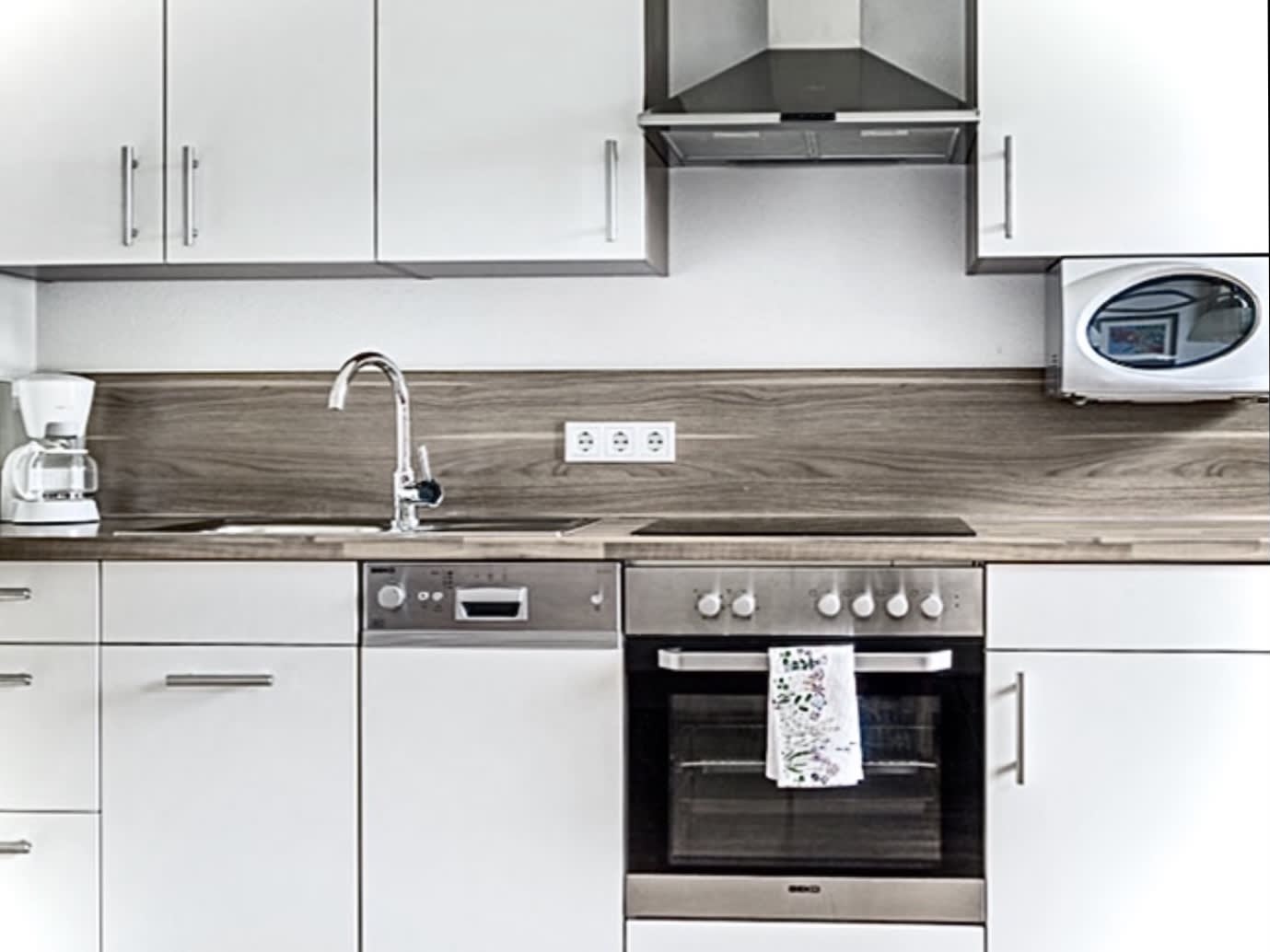 • mit gemütlicher Wohnküche (Backofen, Ceranfeld, Mikrowellenherd, Kühlschrank, Gefrierschrank, Geschirrspüler, Kaffeemaschine, Toaster, Wasserkocher, Töpfen, Pfannen, Geschirr, Besteck,....)