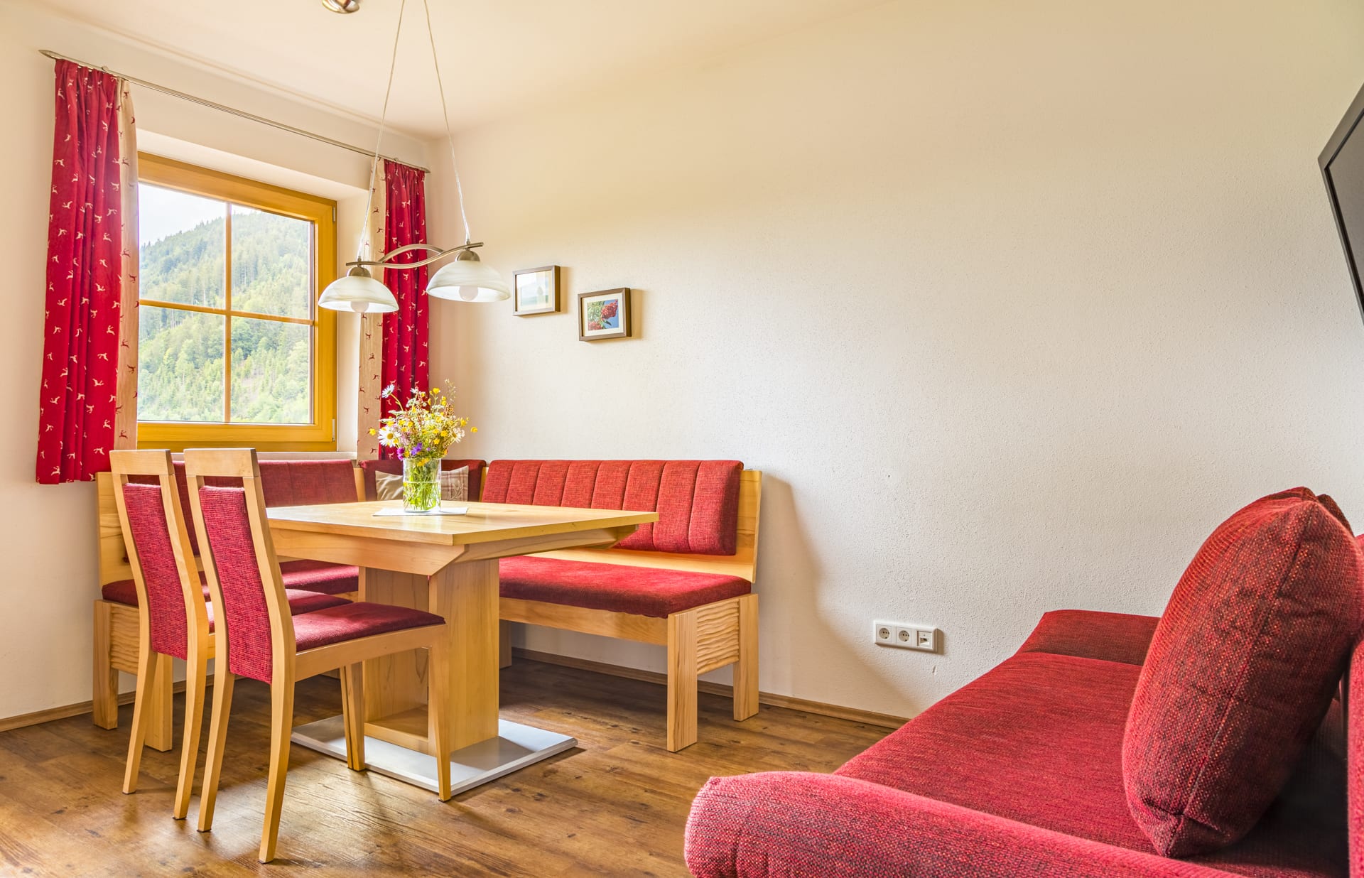 • rustikalem Esstisch und Vollholz-Eckbank, Doppelcouch, Zweibettzimmer, Bad und WC getrennt ausgestattet.